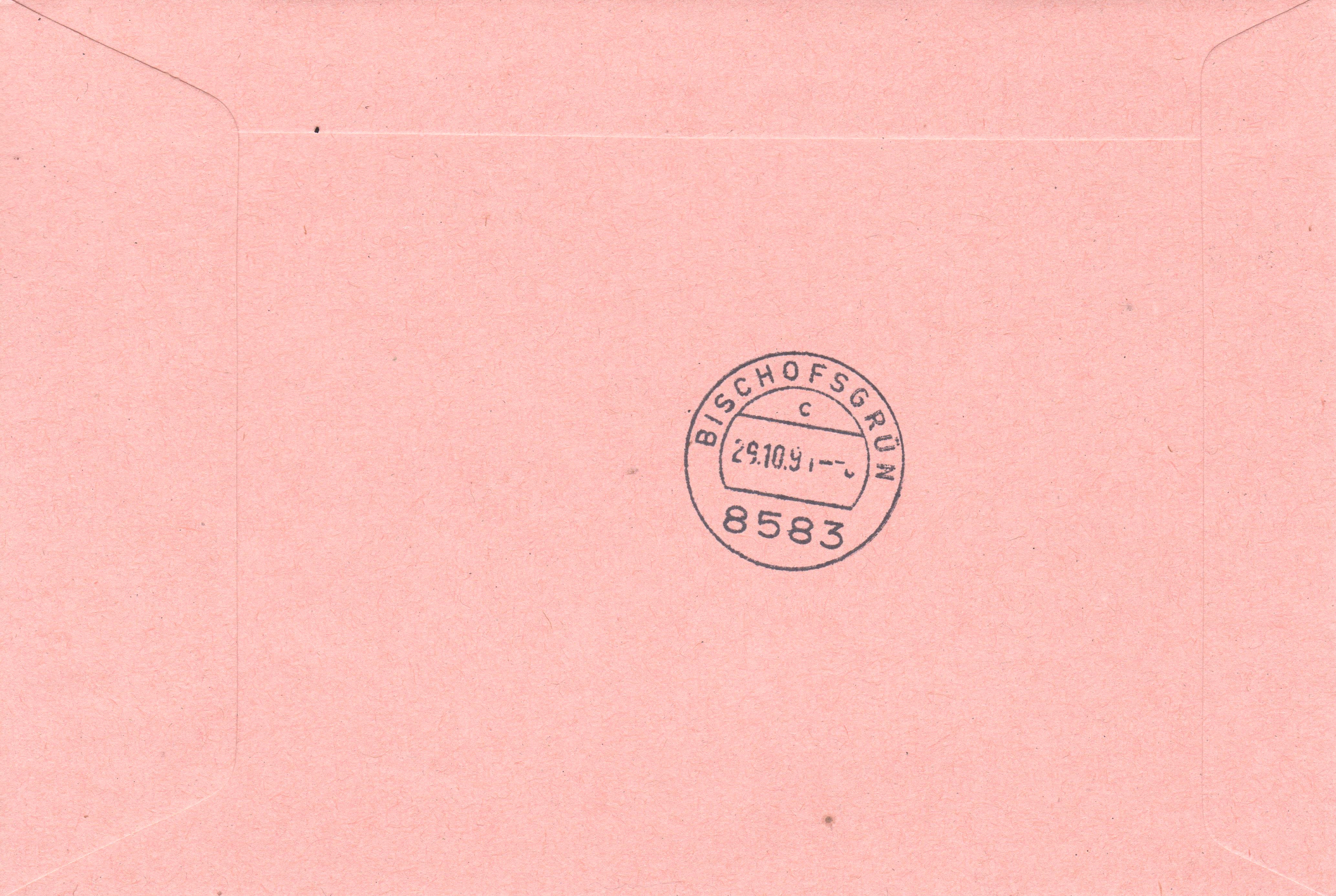 Rückseitiger Ankunftstempel 8583 BISCHOFSGRÜN vom 29.10.1991: