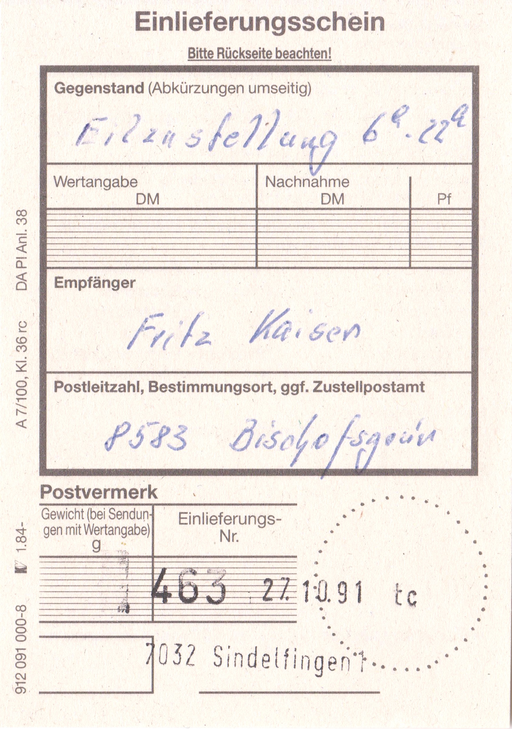 Der Beleg mit dem 4-er-Streifen dagegen hat auf dem Einschreib-Zettel neben der Nummer die Postamtsbezeichnung. Hierin lag allerdings kein Einlieferungsbeleg.
