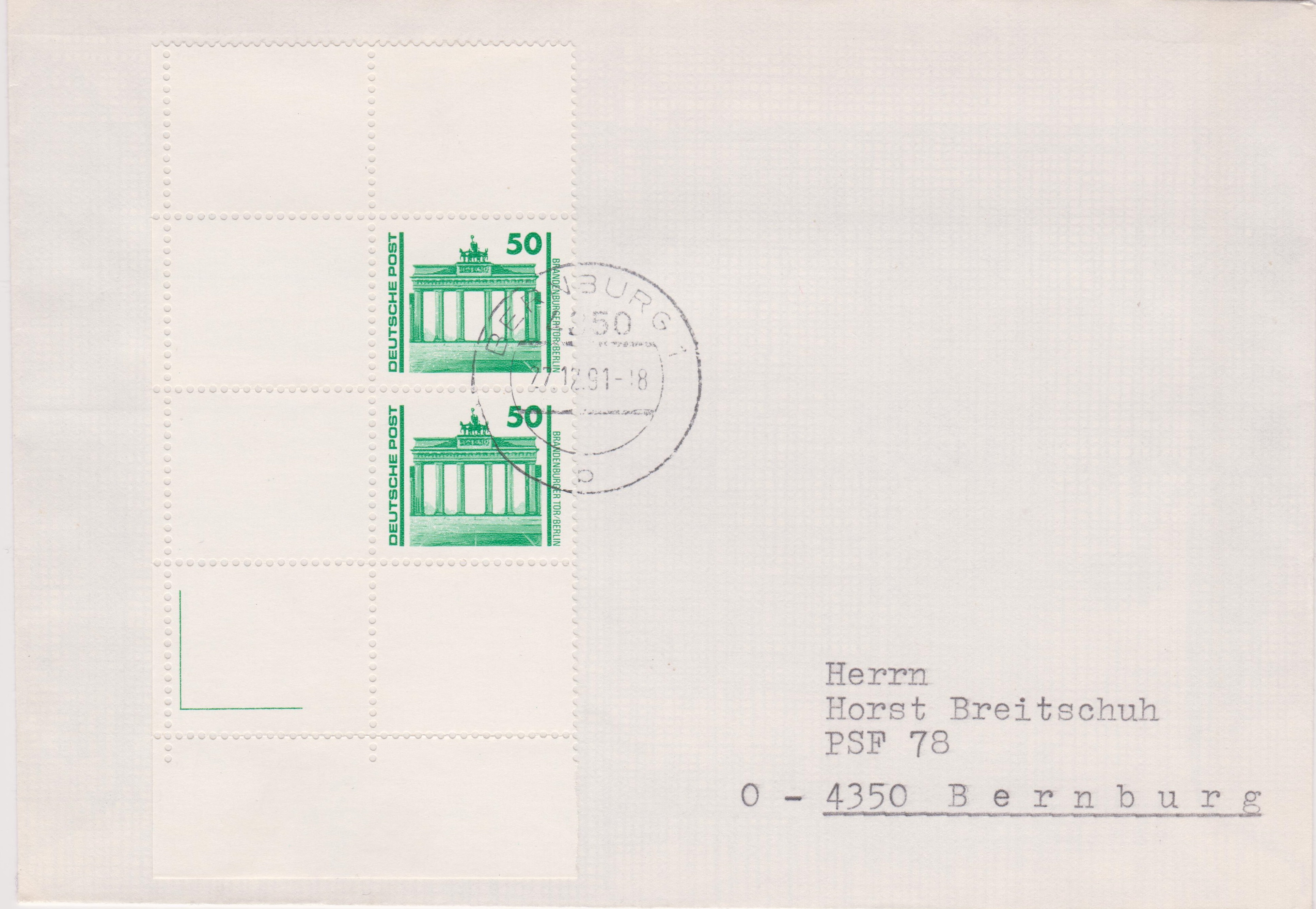 Linke untere Bogenecke des Markenheftchenbogens MHB 21, am 27.12.1991 auf Brief innerhalb von O-4359 Bernburg gelaufen:
