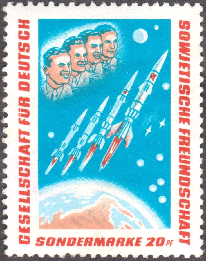 Spendenmarke 20 Pf der GESELLSCHAFT FÜR DEUTSCH SOWJETISCHE FREUNDSCHAFT mit einem Raumfahrtmotiv, ausgegeben 1963:
