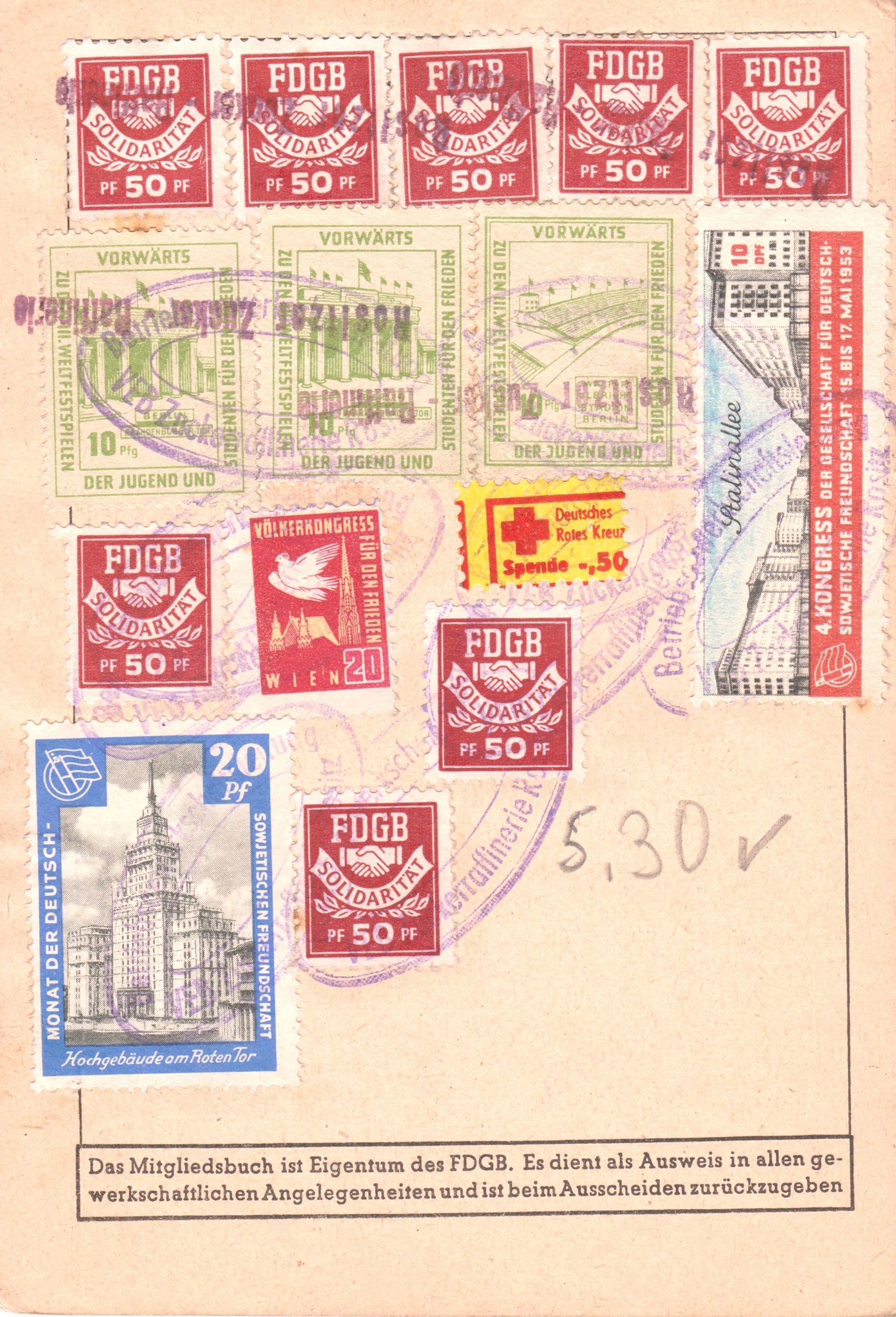 Spendenmarke 10 DPF der GESELLSCHAFT FÜR DEUTSCH-SOWJETISCHE FREUNDSCHAFT, ausgegeben 1953 zum "4. KONGRESS DER GESELLSCHAFT FÜR DEUTSCH-SOWJETISCHE FREUNDSCHAFT 15. BIS 17. MAI 1953":