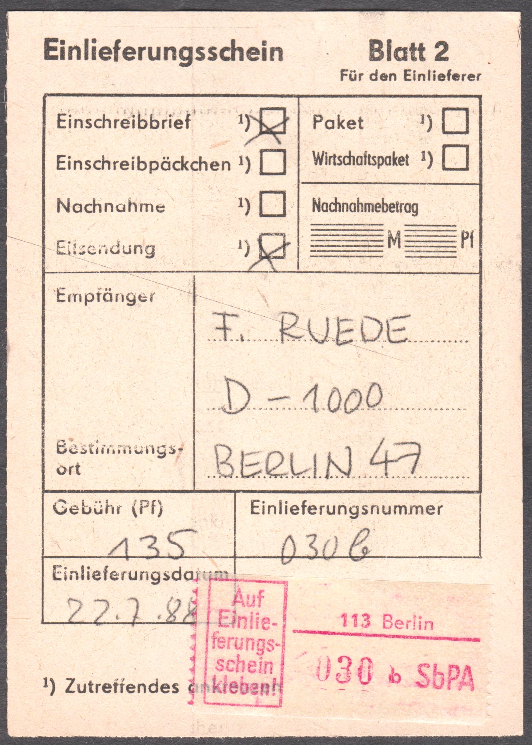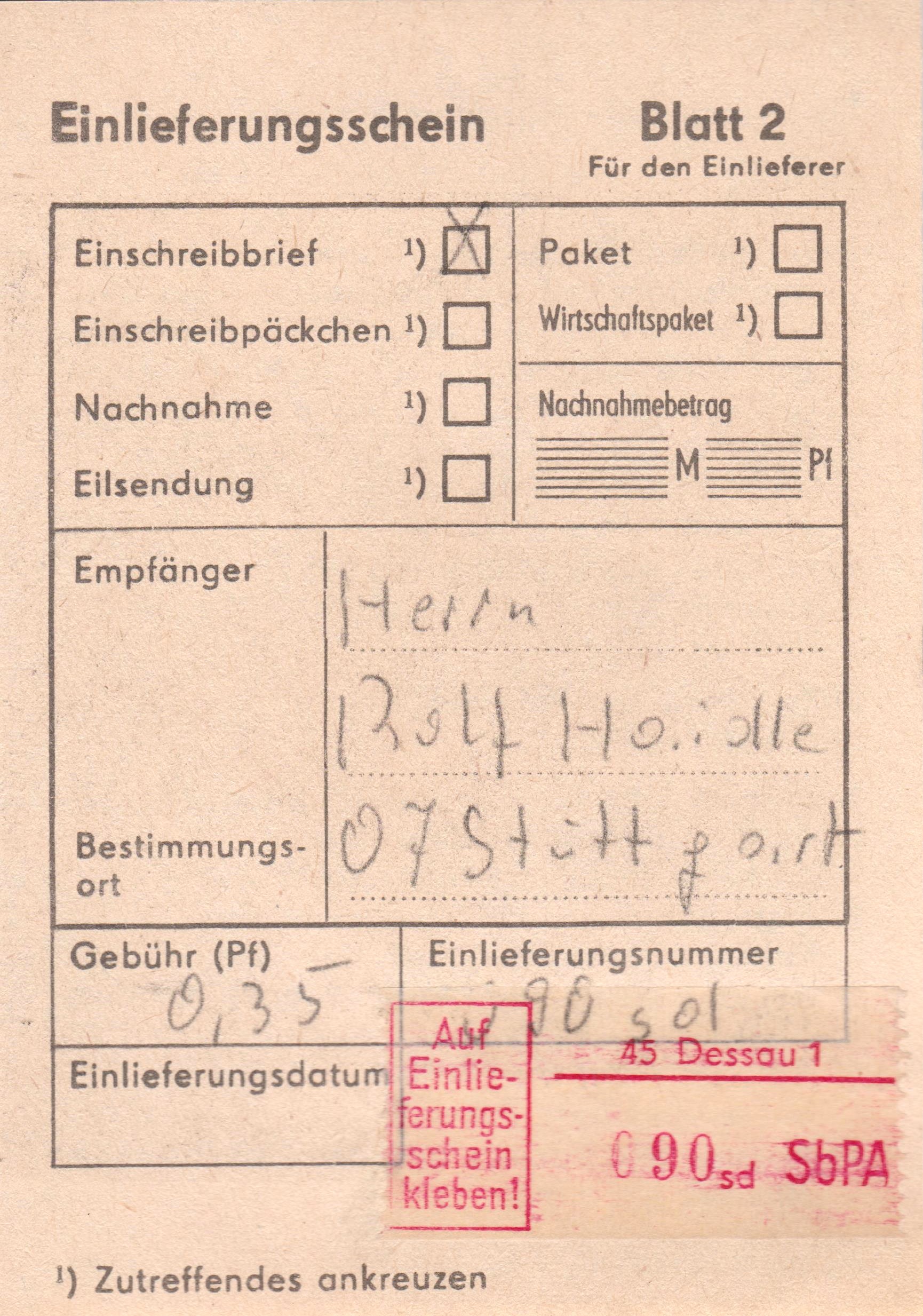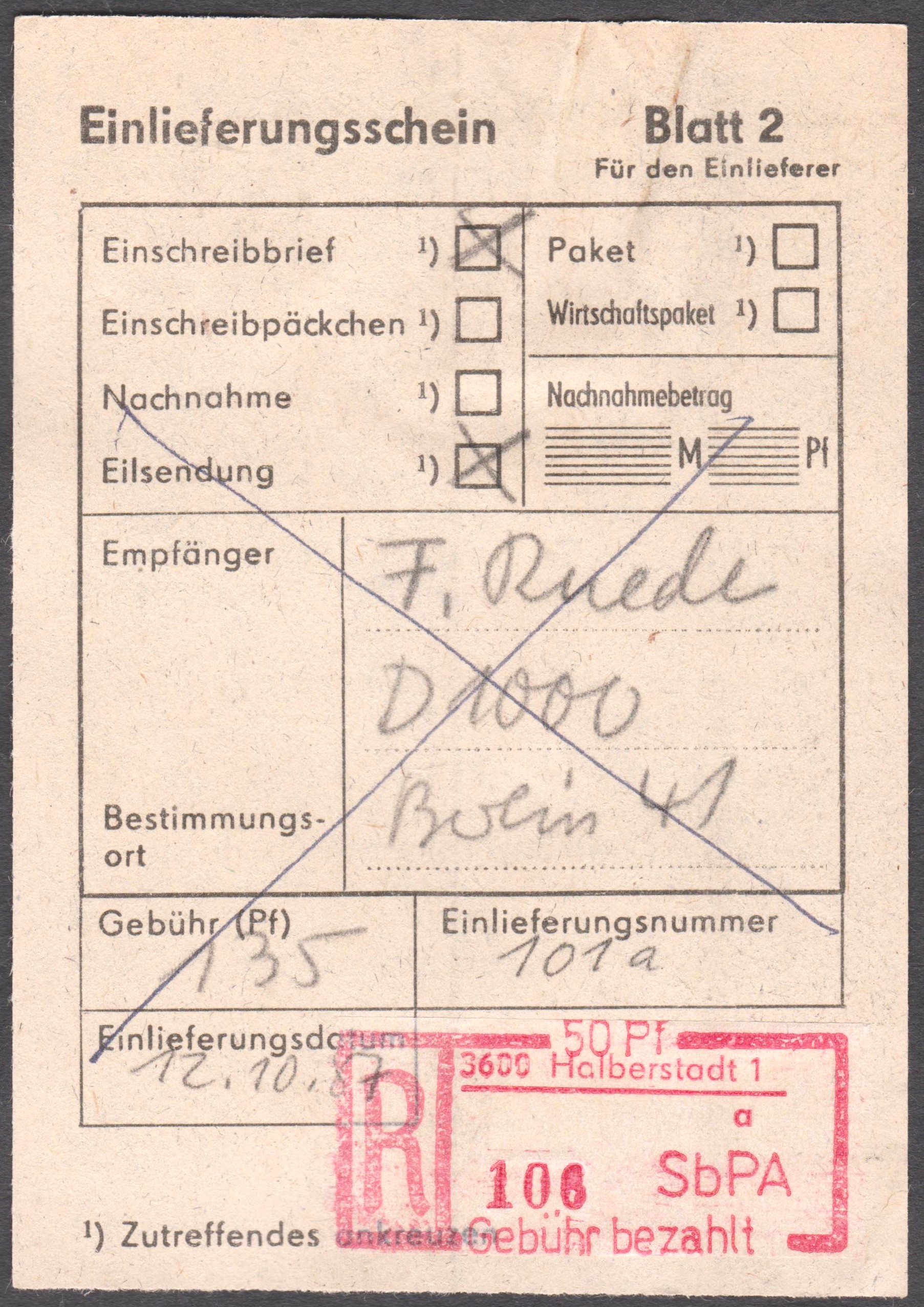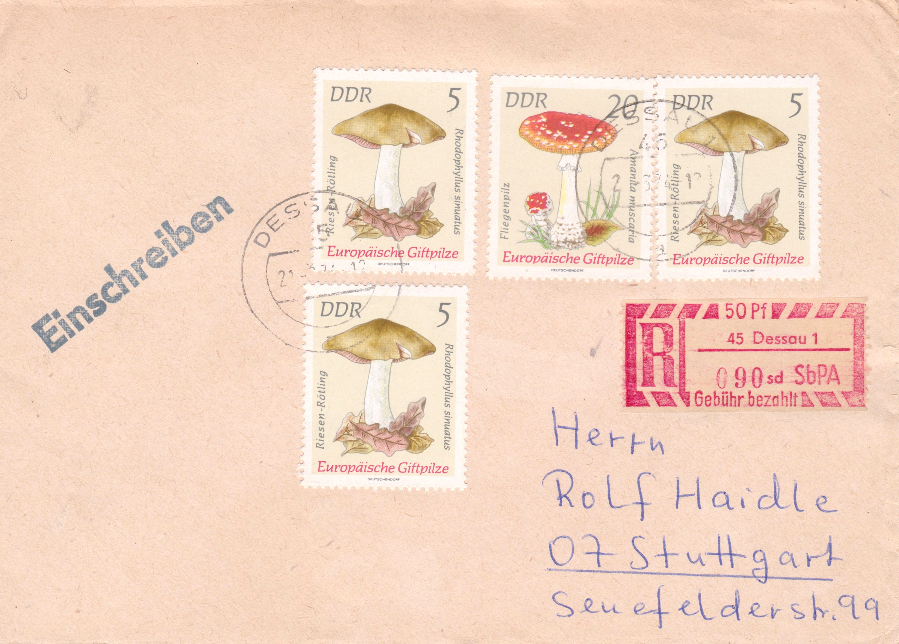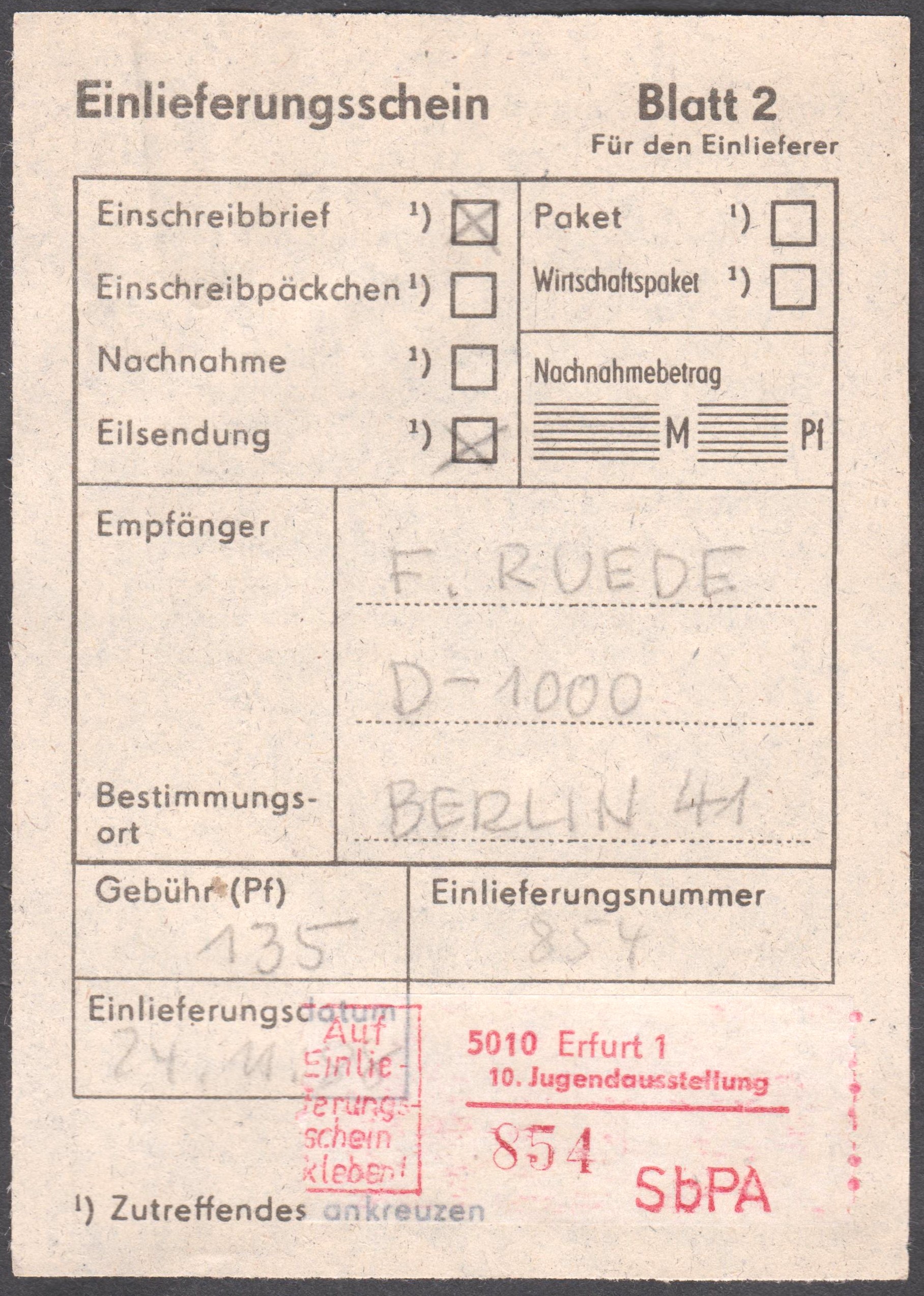 Brief von Schwerin nach Amberg in der Oberpfalz mit einem Einschreibe-Gebührenzettel des SbPA 27 Schwerin 1 und den beiden Marken zum Jubiläum "20 Jahre Pionierorganisation Ernst Thälmann" (MiNr 1432/1433). Der Brief ist 5 Pfennig überfrankiert.