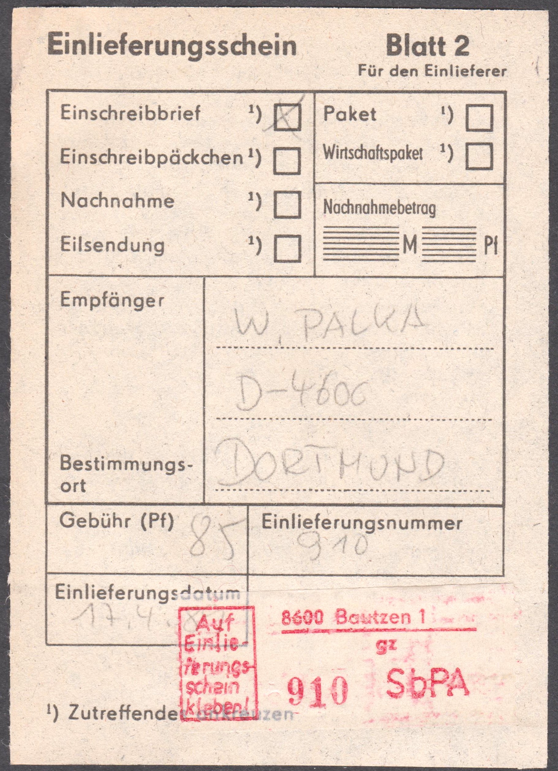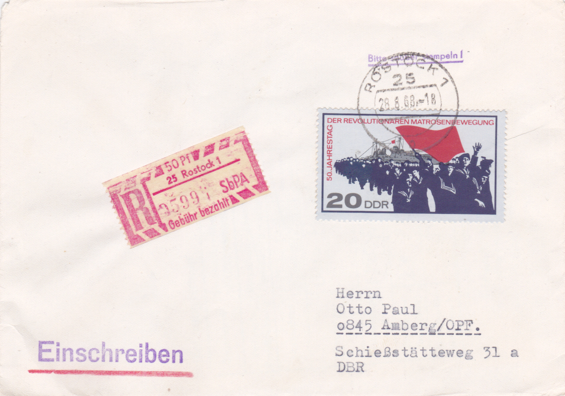 Brief von Rostock nach Amberg in der Oberpfalz mit einem Einschreibe-Gebührenzettel des SbPA 25 Rostock 1 und einer Marke zu 20Pf aus der Serie "50. Jahrestag der revolutionären Matrosenbewegung" (MiNr 1310).