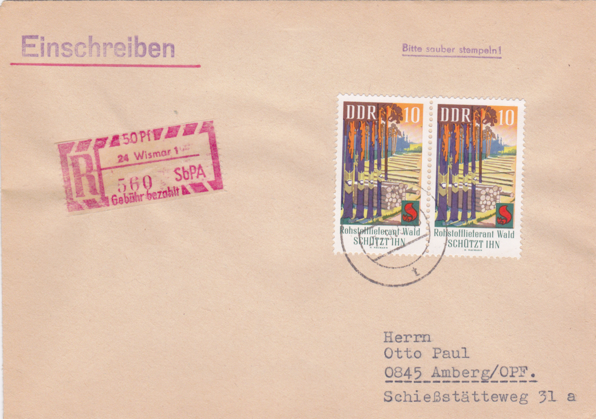 Brief von Wismar nach Amberg in der Oberpfalz mit einem Einschreibe-Gebührenzettel des SbPA 24 Wismar 1 und zwei Marken zu je 10Pf aus der Serie "Waldschutz" (MiNr 1463).
