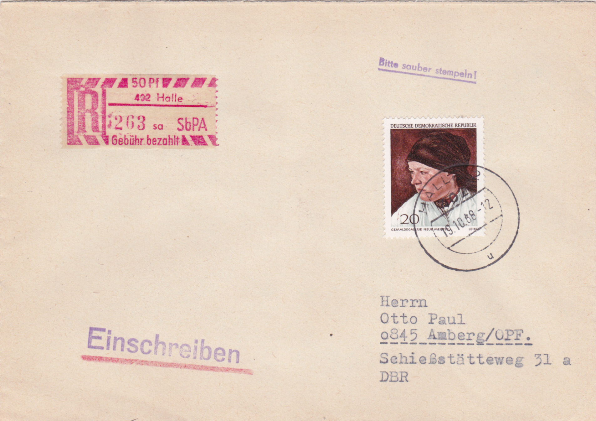 Brief von Halle vom 19.10.1968 nach Amberg in der Oberpfalz mit einem Einschreibe-Gebührenzettel des SbPA 402 Rostock und einer Marke zu 20Pf aus der Serie "Staatliche Kunstsammlungen Dresden, Galerie Neue Meister" (MiNr 1395).