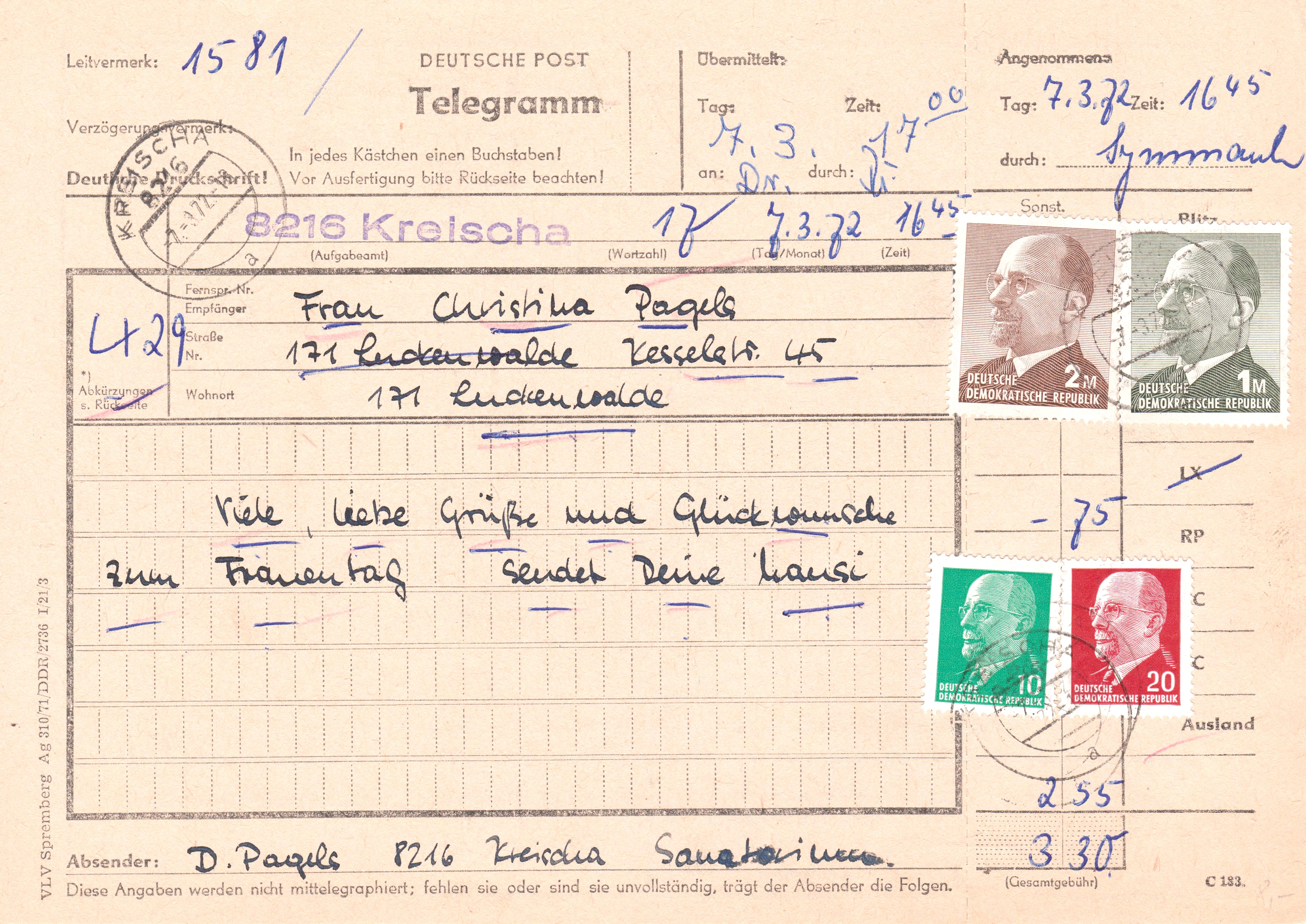 Gewünscht wurde ein Schmuckblatt-Telegramm "LX-18", das -,75 Mark extra kostete!