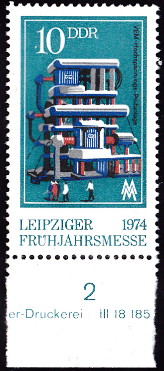 Diese Marke zu 10Pf zur Leipziger Frühjahrsmesse1974 (MiNr 1931) zeigt eine Gleichspannungs-Prüfanlage für Hochspannungen bis 2000 kV. Bei dieser Marke ist ein "halber Druckvermerk" auf dem Bogenrand zu sehen.