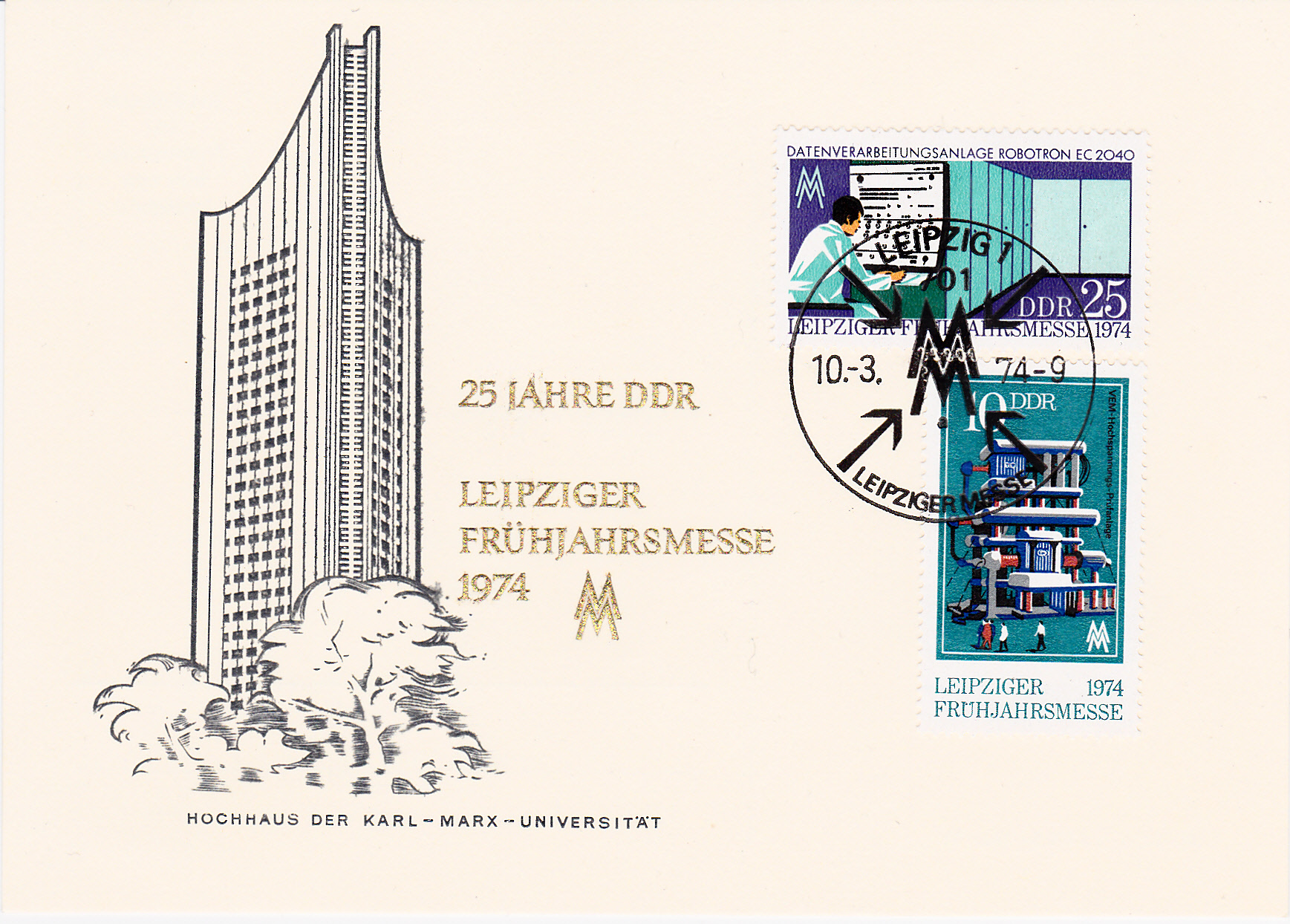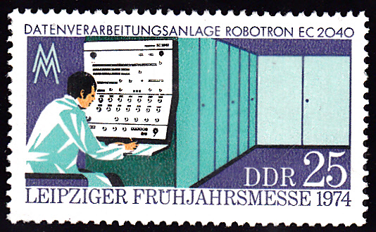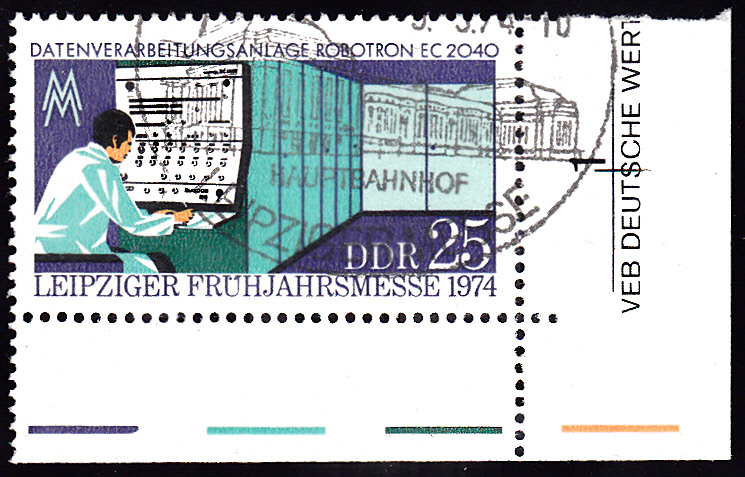 Ebenfalls zur Leipziger Frühjahrsmesse1974 ist diese Marke zu 25Pf (MiNr 1932) mit dem Bild einer Datenverarbeitungsanlage ROBOTRON EC 2040 (Zentraleinheit).