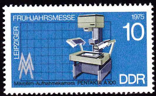 Zur Leipziger Frühjahrsmesse 1975 ist diese Marke zu 10Pf (MiNr 2023) mit einer Mikrofilm-Aufnahmekamera PENTAKTA A 100 erschienen.