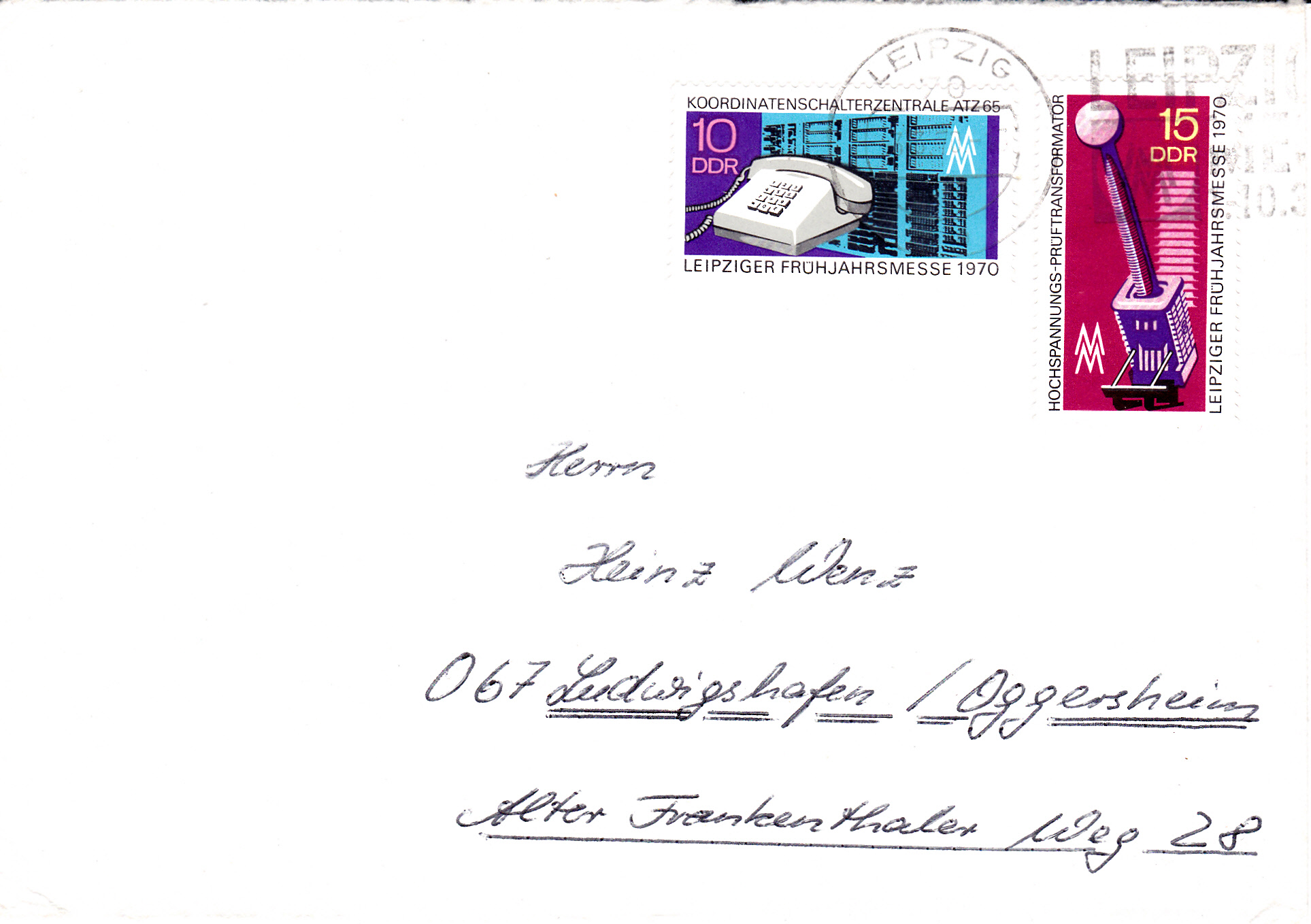 Ein Paar der Marke zur Leipziger Herbstmesse 1970 (MiNr 1610) ist auf diesem Brief von Leuna nach Böhl-Iggelheim portogerecht zur Frankatur eines Standardbriefes verwendet worden.