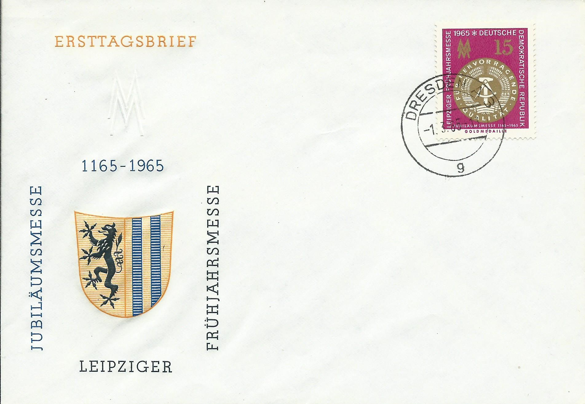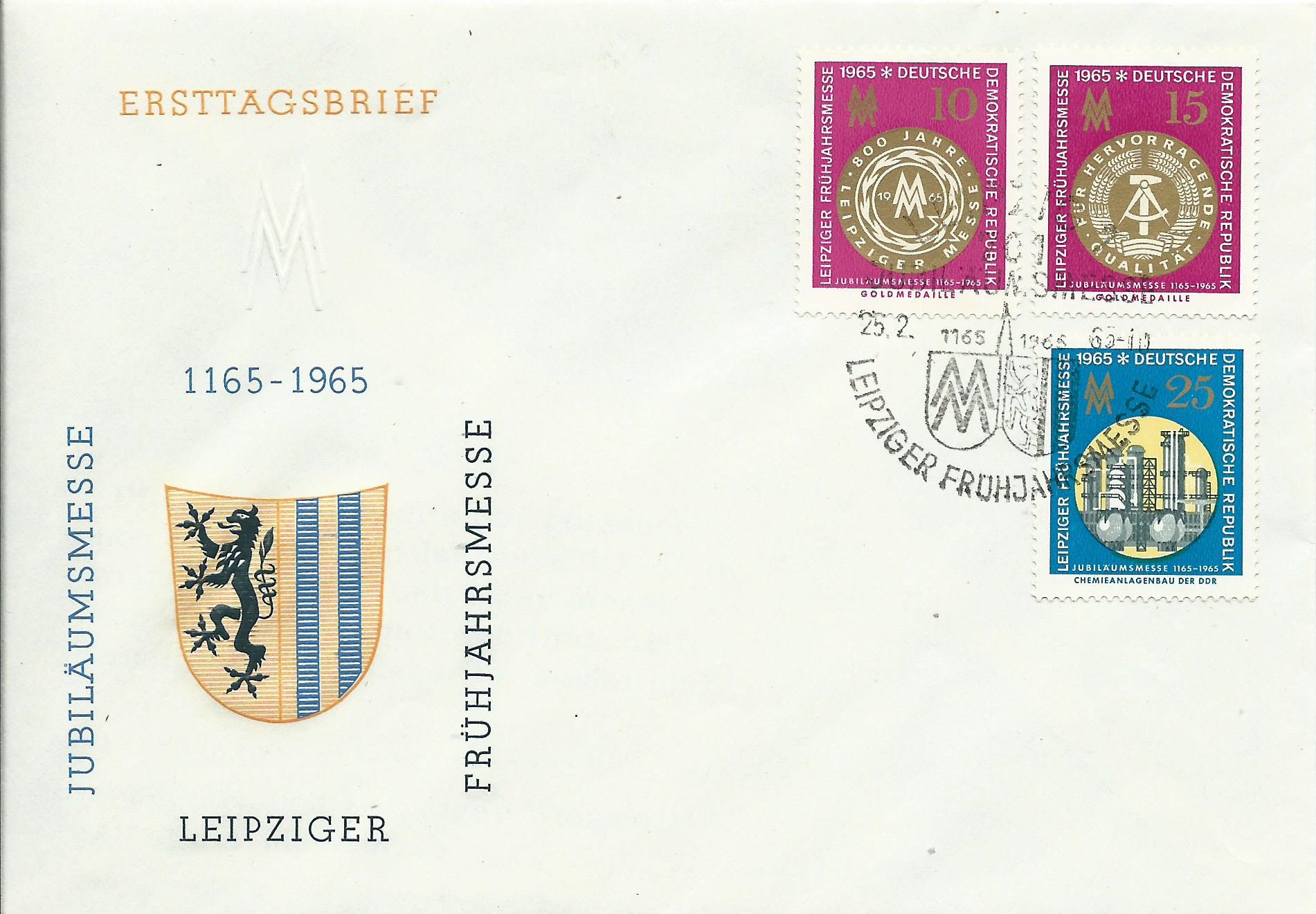 Heinz hat ja hier schon die ganzen Ausgaben der Leipziger Messe vorgestellt. Mir sind dazu noch einige Belege in einer Wühlkiste aufgefallen. Hier kommen die Ausgaben zur Leipziger Frühjahrsmesse 1965, Mi.Nr. 1090 – 1092. Den Anfang macht ein Ersttagsbrief mit allen 3 Werten mit dem Ersttagsstempel aus Leipzig vom 25.2.65: