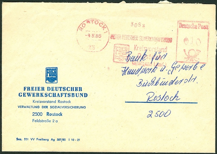 Dieser Rostocker Absenderfreistempel benennt den FDGB als Absender. Den Kreisvorstand des Freien Deutschen Gewerkschaftsbundes. 1986 hatte er seine gewerkschaftliche Rolle noch gesamtgesellschaftlich inne.