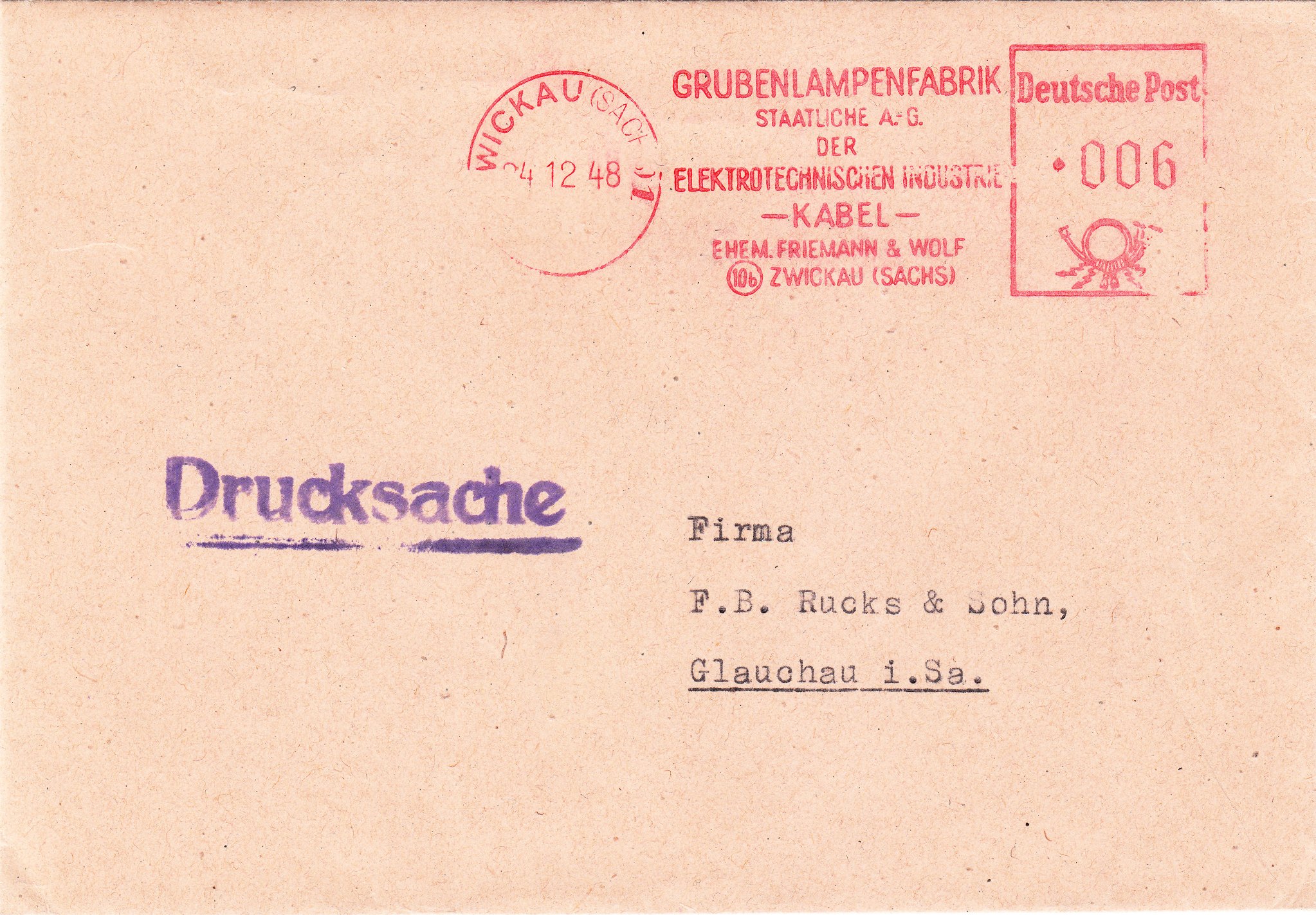 1946 Enteignung der GmbH. Das Unternehmen wurde zunächst als Betrieb der SAG-Kabel Grubenlampenfabrik Zwickau fortgeführt., siehe diesen Absenderfreistempel vom 24.12.1948: