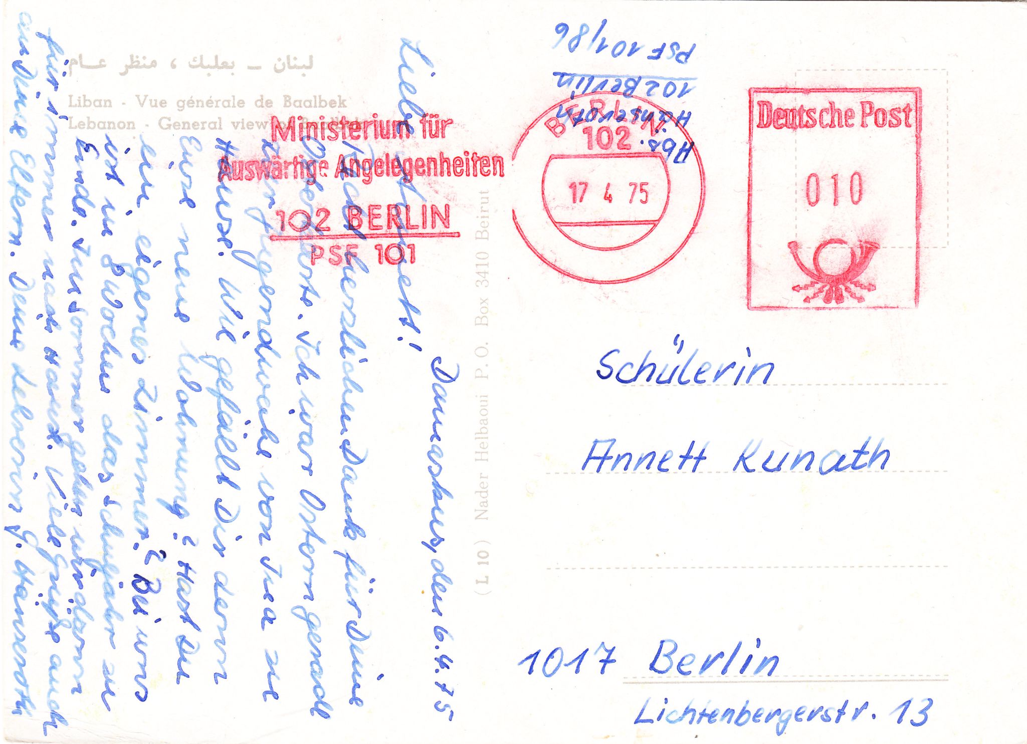 Ansichtskarte aus dem Libanon, geschrieben am 06.04.1975 in Damaskus in Syrien, frankiert am 17.04.1975 per Absenderfreistempel "Ministerium für Auswärtige Angelegenheiten" zum Inlandstarif von 10 Pfennig: