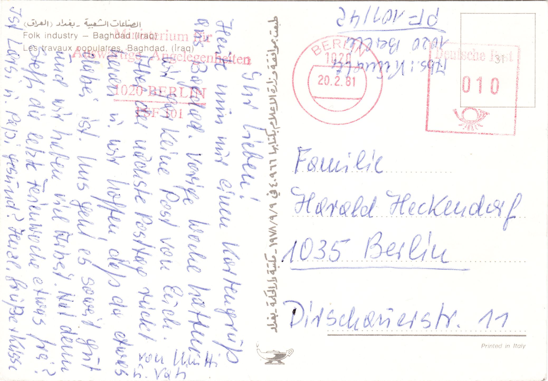 Hier ein zweiter solcher Beleg in Form einer Ansichtskarte aus Bagdad im Irak mit Absendervermerk "PF 101/42", die "42" steht demnach für den Irak als Aufgabeland, befördert per Kurier nach Berlin und dort am 20.02.1981 freigemacht mit 10 Pfennig entsprechend einer Postkarte im Inlandsverkehr: