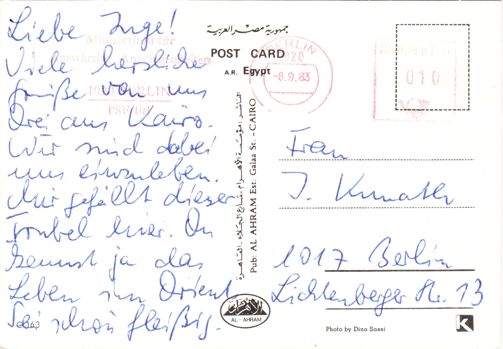 Ansichtskarte aus Cairo in Ägypten, befördert per Kurier nach Berlin, dort am 08.09.1983 mit 10 Pfennig per Absenderfreistempel des Ministeriums für Auswärtige Angelegenheiten als Postkarte im Inlandsverkehr korrekt freigemacht: