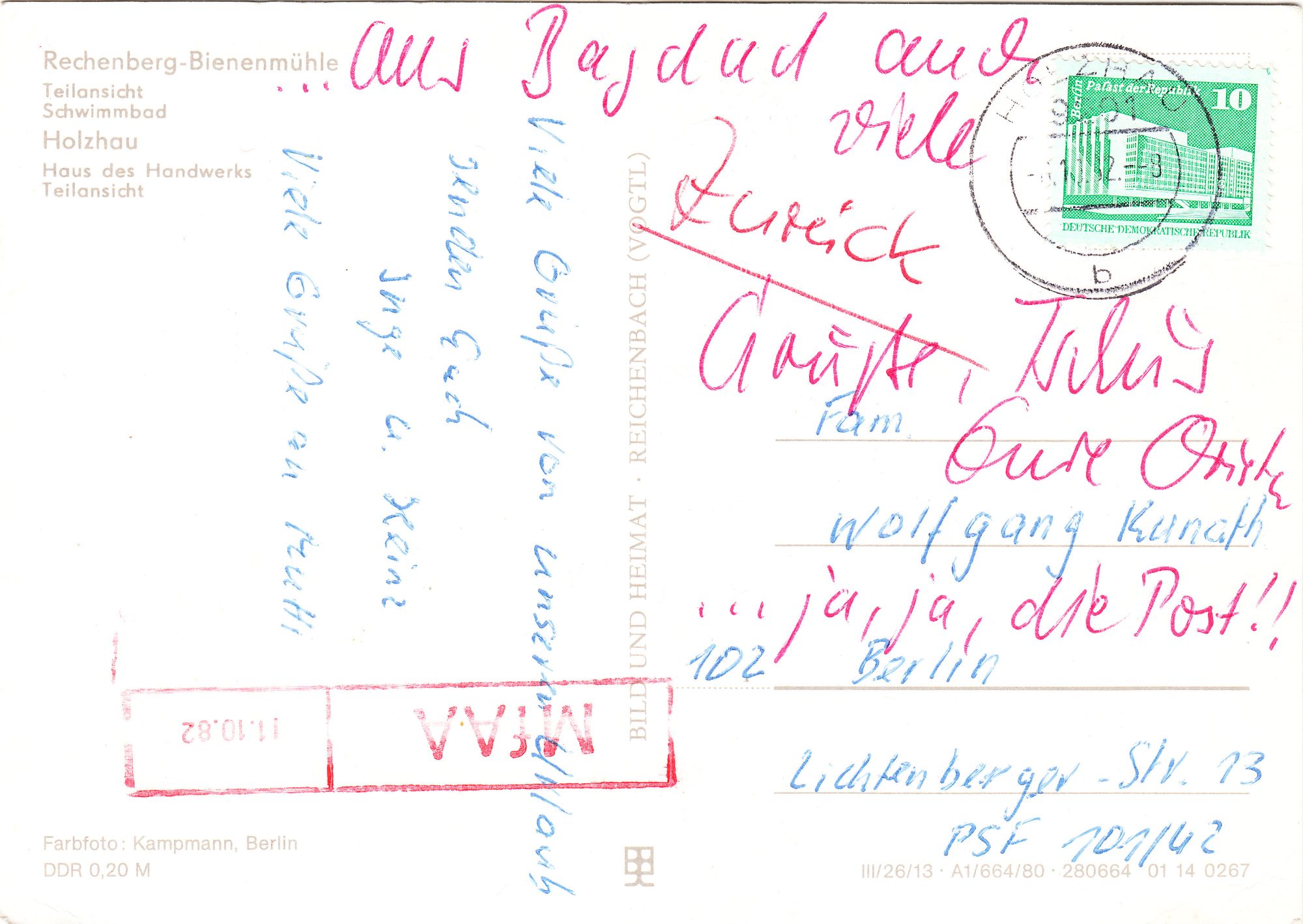 In diesem Falle lief die in Holzhau aufgegebene Ansichtskarte über das PSF 101 des "MfAA" der "42" für den Irak entsprechend per Kurierpost nach Bagdad, wurde dort mit einem Gruß versehen und ging per Kurierpost wieder "zurück"!