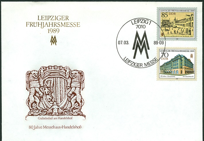 Nachtragen kann ich heute einen Ersttagsbriefumschlag für die Leipziger Messemarken "Frühjahr 1989". Entwertet wurden die beiden Marken mit dem Ersttagssonderstempel dieser Ausgabe.