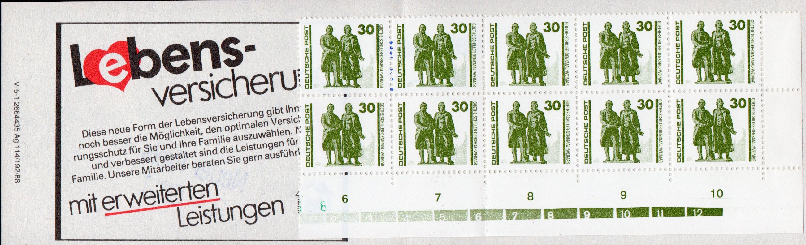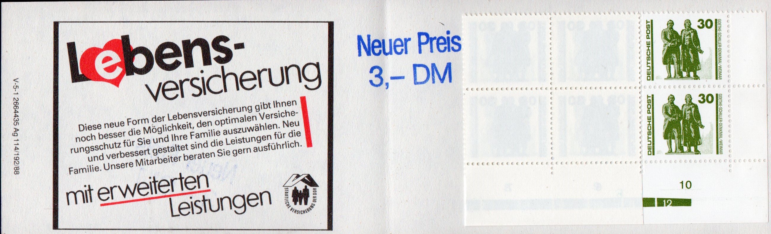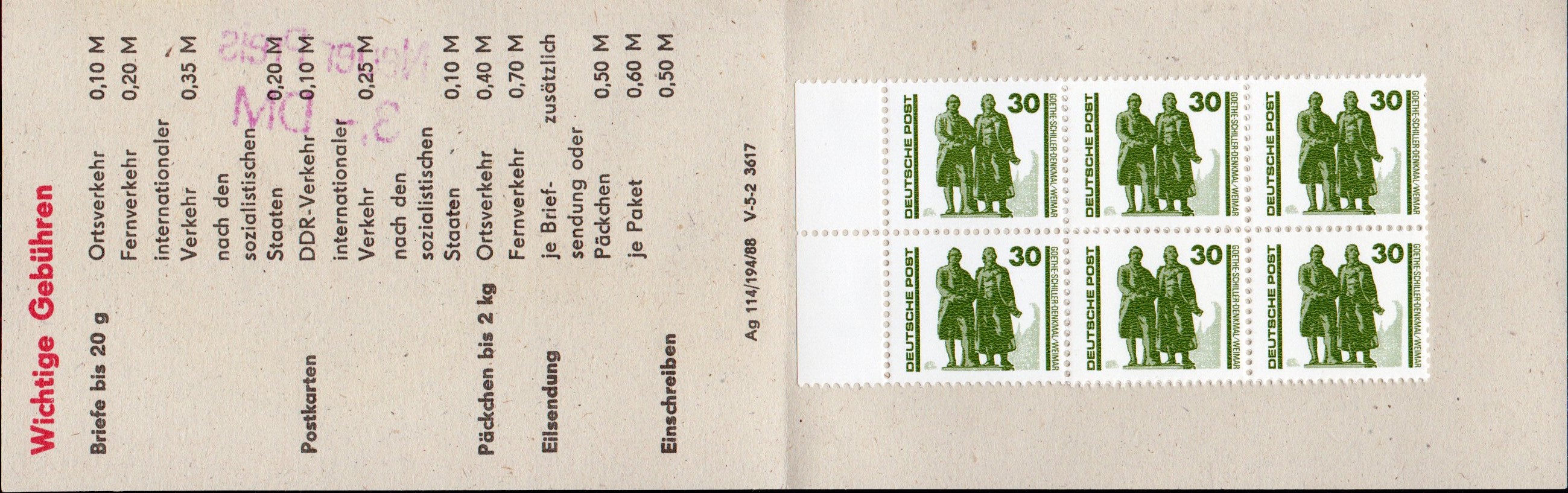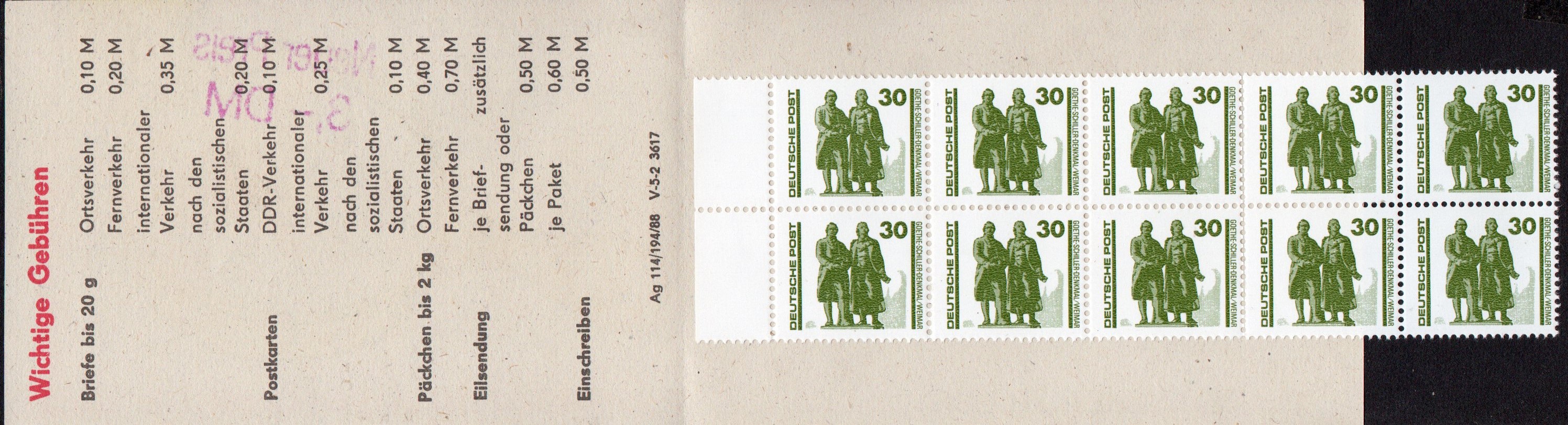 Dieses Heftchen wurde auch mit dem 30-Pfg-Wert "Goethe-Schiller-Denkmal Wismar" bestückt, worauf eine kurze Notitz im Michel-Spezial-Katalog hinweist.