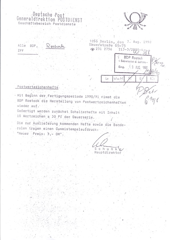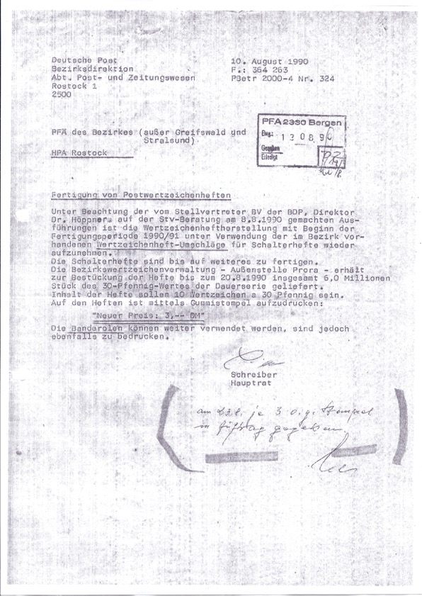 Ich war skeptisch, da bin ich ehrlich. So etwas hatte ich bislang noch nicht gesehen, wer schaut auch schon als Sammler dieser Dauerserie bei den Sondermarkenheftchen 1988? Diese Markenheftchen wurden im Bereich Rostock / Rügen verkauft. Mir liegen 2 elektronische Kopien der damaligen Dienstanweisungen vor, die ich gern hier zeige.