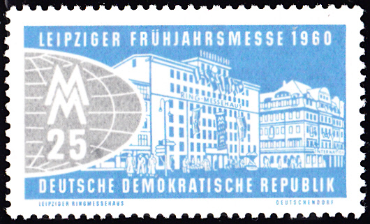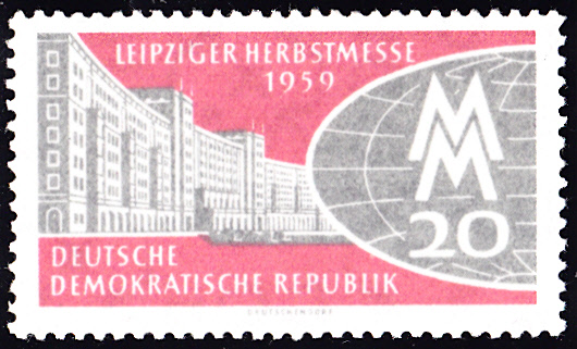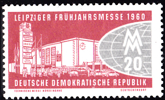 Zur Leipziger Frühjahrsmesse 1960 erschienen wieder zwei Marken. Huer die Marke zu 20Pf (MiNr 750) mit dem Nordeingang der Technischen Messe, einem Teil einer stilisierten Erdkugel und dem Messezeichen.