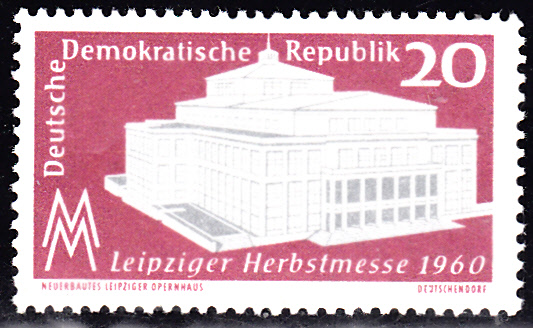 Auf der Marke zu 20Pf zur Leipziger Herbstmesse 1960 (MiNt 781) wird das neu erbaute Opernhaus in Leipzig abgebildet.