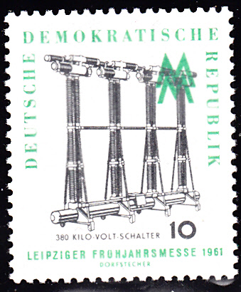 Zur Leipziger Frühjahrsmesse 1961 ist diese Marke zu 10Pf (MiNr 813) erschienen. Sie zeigt einen 380-Kilovolt-Schalter.
