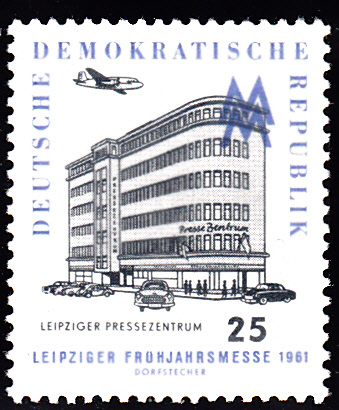 Ein zweite Marke zu dieser messe 1961 (MiNr 814) zeigt das Leipziger Pressezentrum.