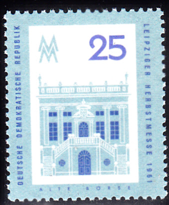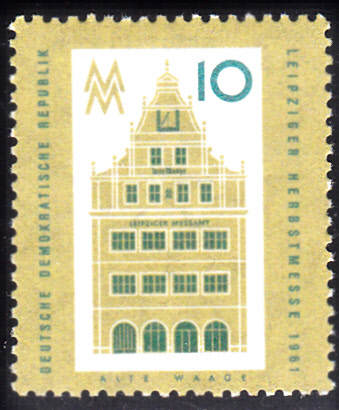 Auf der 10Pf-Marke zur Leipziger Herbstmesse 1961 (MiNr 843) wird die Alte Waage gezeigt. Die Alte Waage ist ein 1963/1964 teilweise nach historischem Vorbild rekonstruiertes Gebäude an der Nordseite des Leipziger Marktplatzes an der Ecke zur Katharinenstraße.