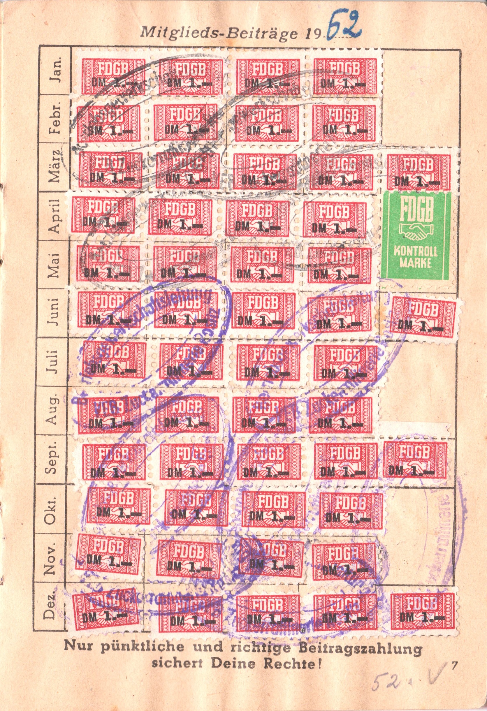 Auf der Rückseite wurden Beitragsmarken für 1972 bis 1975 verklebt: