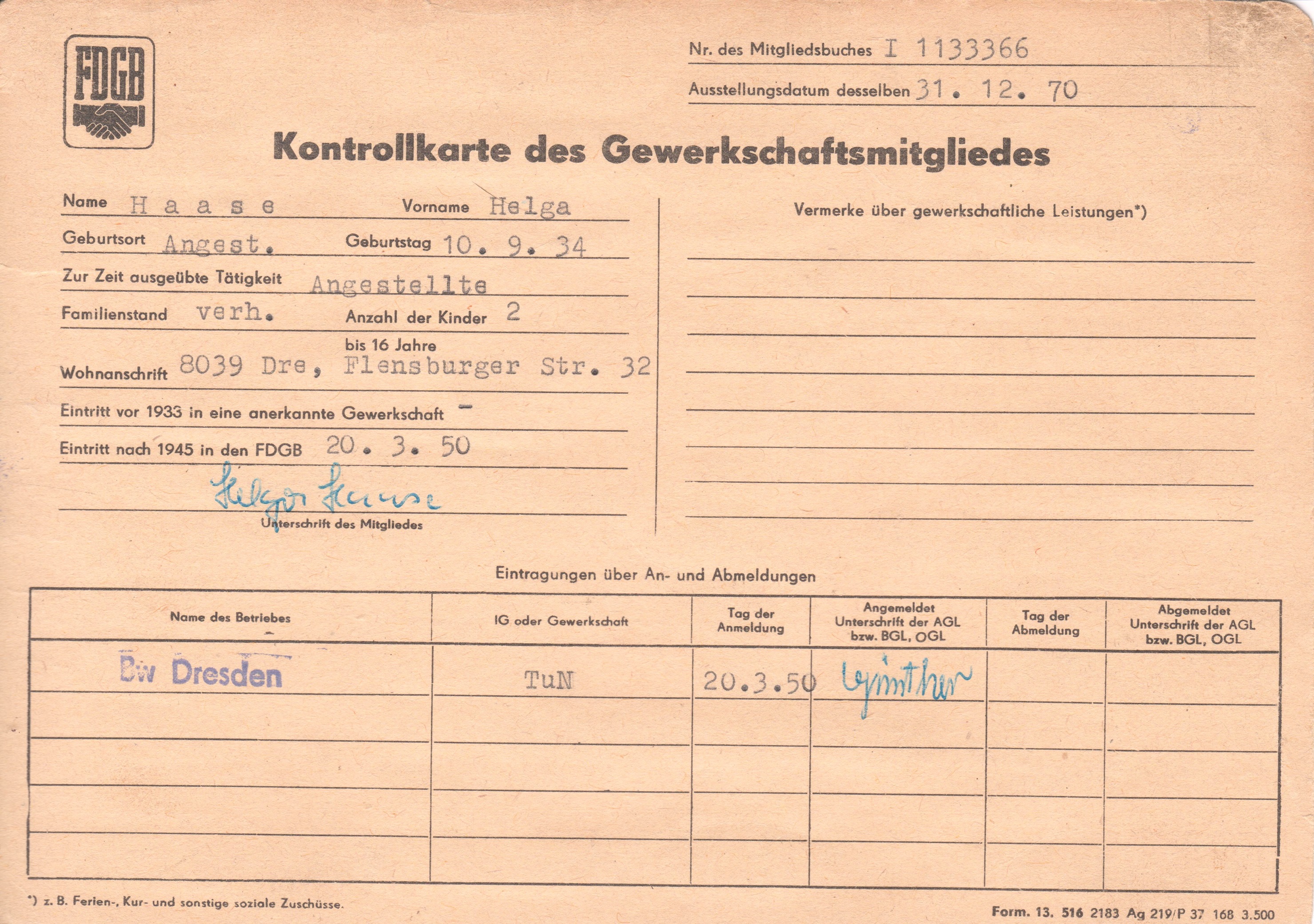 Formular "FDGB Kontrollkarte des Gewerkschaftsmitgliedes":