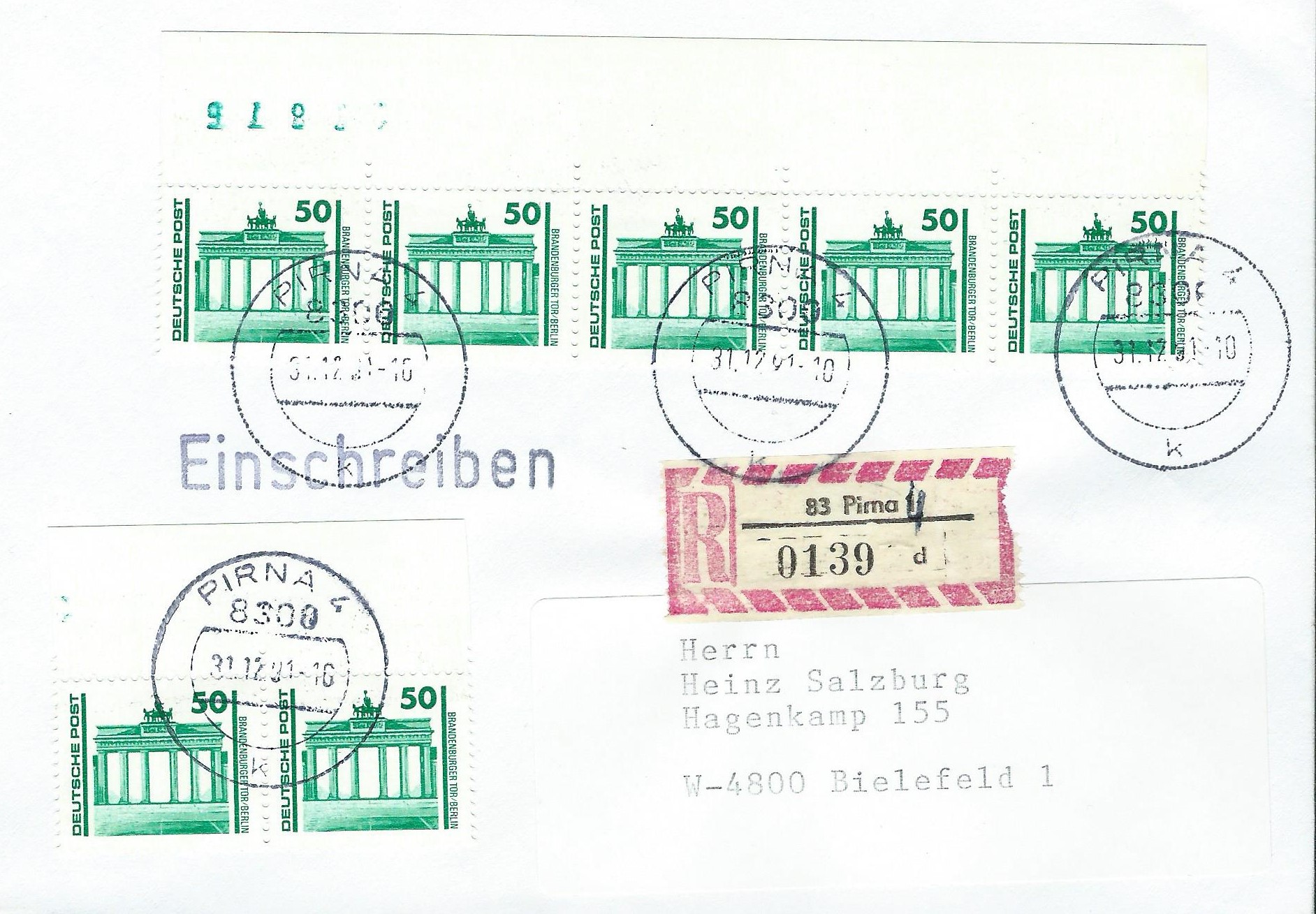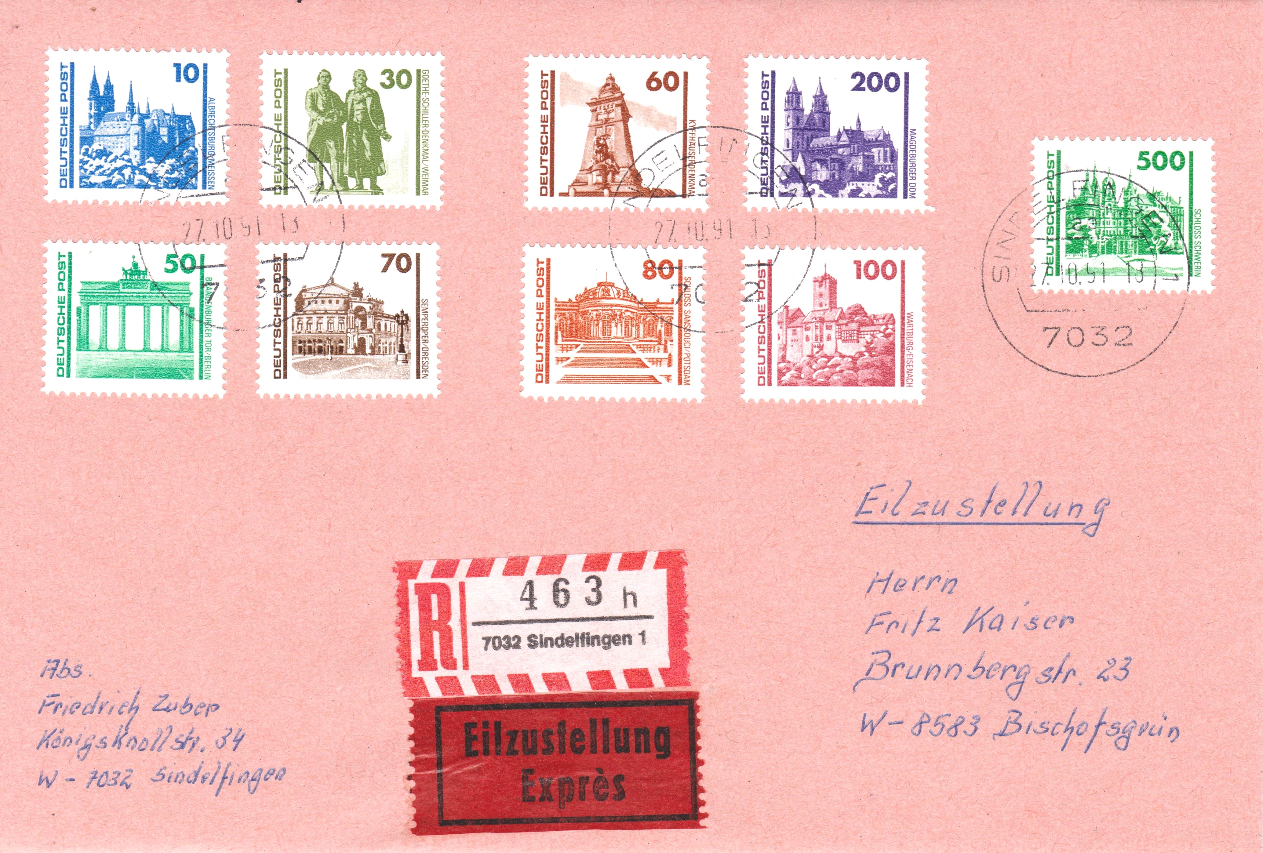 "Satzbrief" der bis zum 31.12.1991 auch in der Bundesrepublik Deutschland gültigen, am 02.07.1990 von der Deutschen Post ausgegebenen Postwertzeichen der Freimarken Bauwerke und Denkmäler, aufgegeben am 27.10.1991 als Sendung per Einschreiben mit Eilzustellung in 7032 Sindelfingen 1: