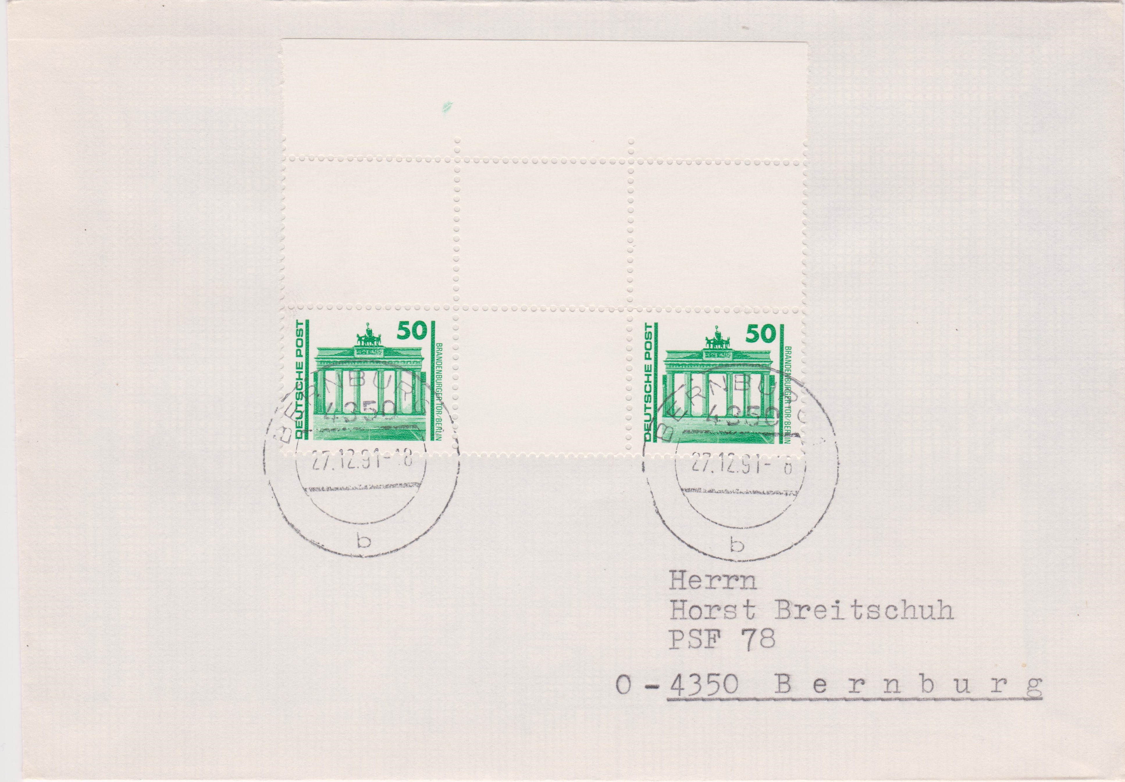 Leider gab es diese Portostufe am 27.10.1991 nicht! Ein Brief von 51 -100 g kostete 240 Pf. Somit ist dieser Satzbrief leider um 10 Pf überfrankiert!