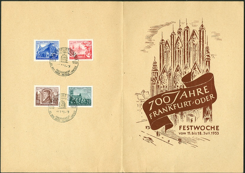Ob diese Kombination von amtlichem Ersttagsbrief und Ersttagsdatum (11.7.1953) des Frankfurt/Oder-Festwochensonderstempels tatsächlich postalisch befördert wurde ist für den aktiven Heimatsammler vielleicht nicht so wichtig. Der rückseitige Dresdener Absenderstempel könnte jedoch dafür sprechen. Die saubere Brieföffnung für den sammelnden Kollegen in "Cehoslovakia" argumentieren. Aber es könnte genausogut eine "Nachbeschriftung" sein.