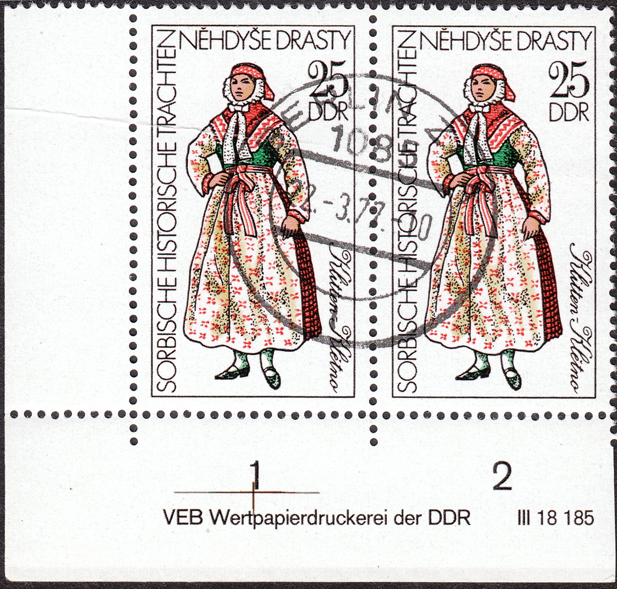 Paar der DDR MiNr. 2212 vom Eckrand 3 mit Druckvermerk "VEB Wertpapierdruckerei der DDR III 18 185", entwertet am 22.03.1997 als Erstausgabetag: