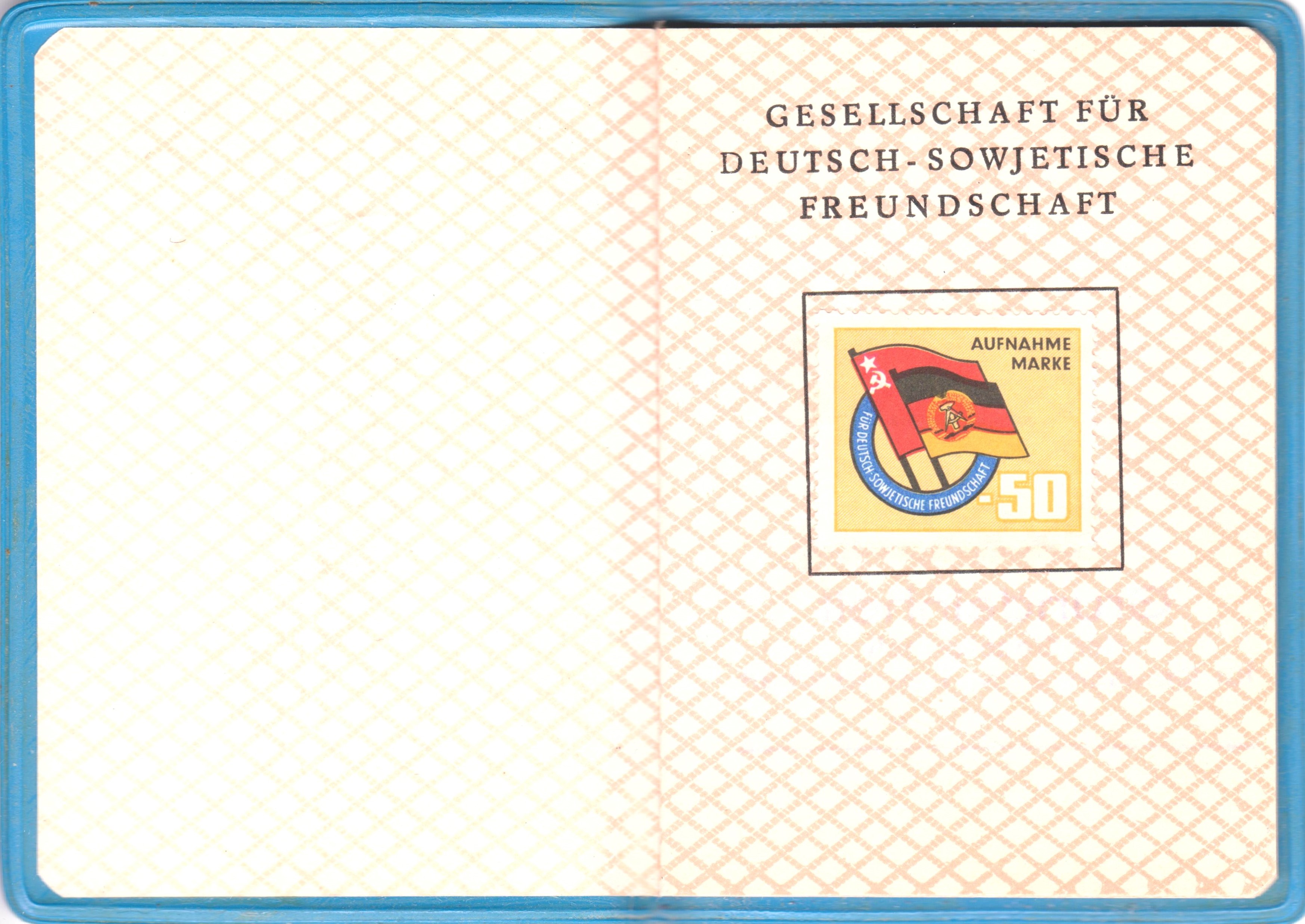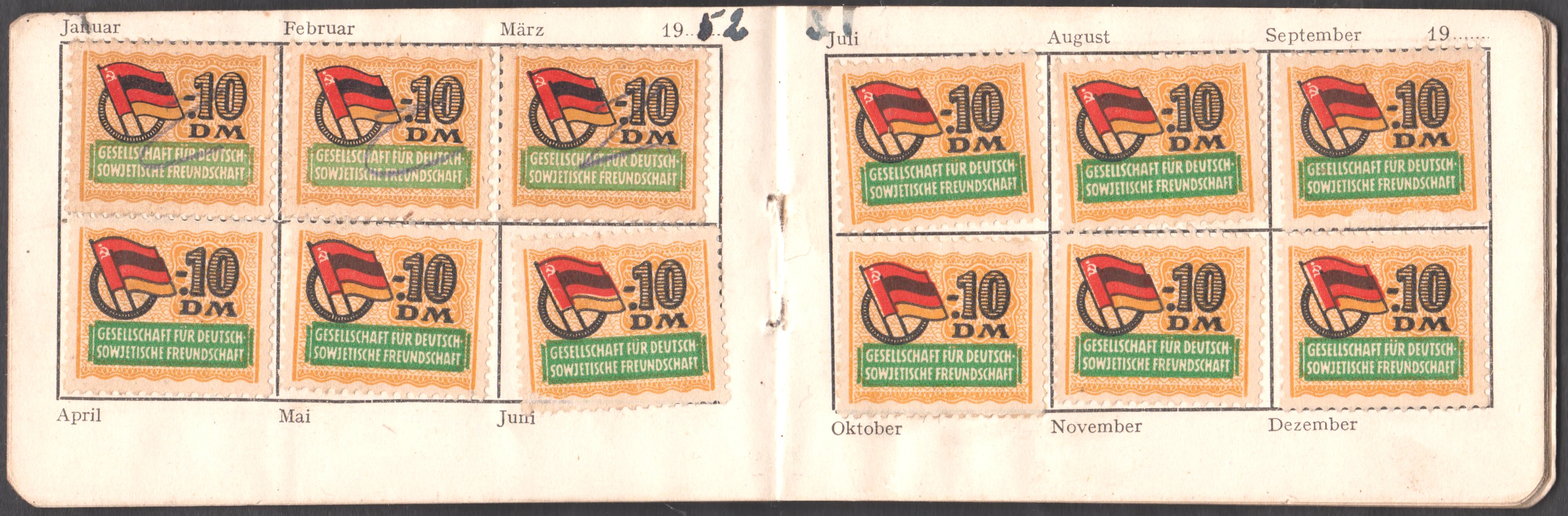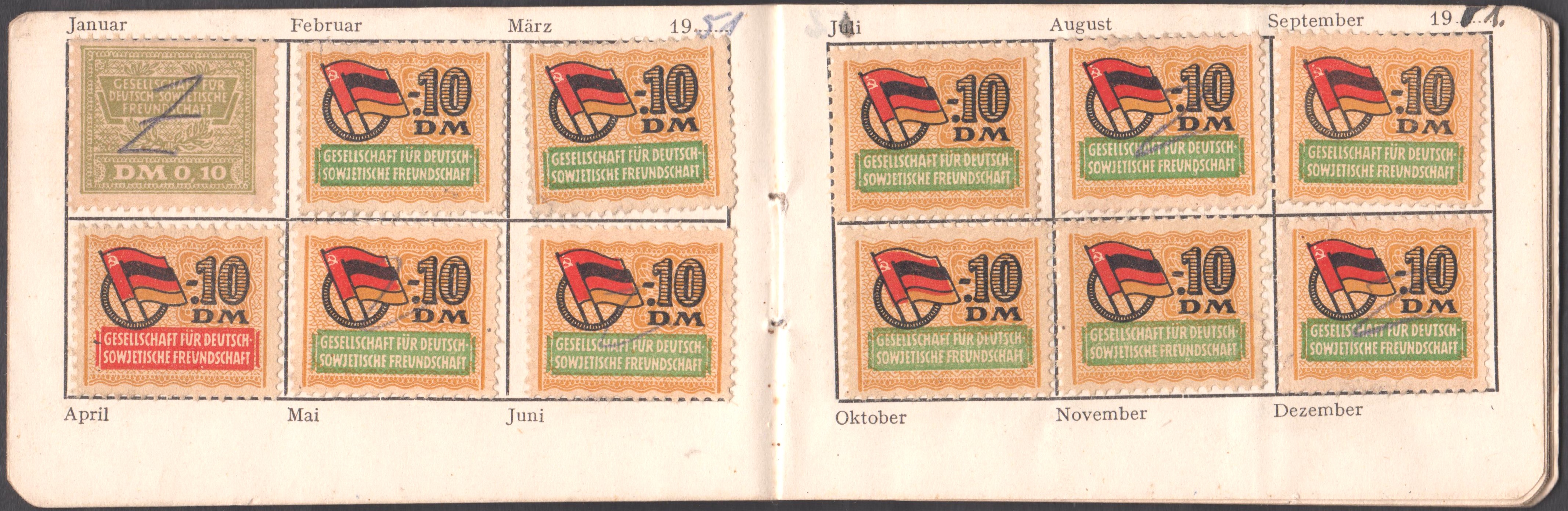 Die zweite Doppelseite dieses Mitgliedsausweises zeigt Gebührenmarken für den Mindestbeitrag von -,50 Mark pro Monat: