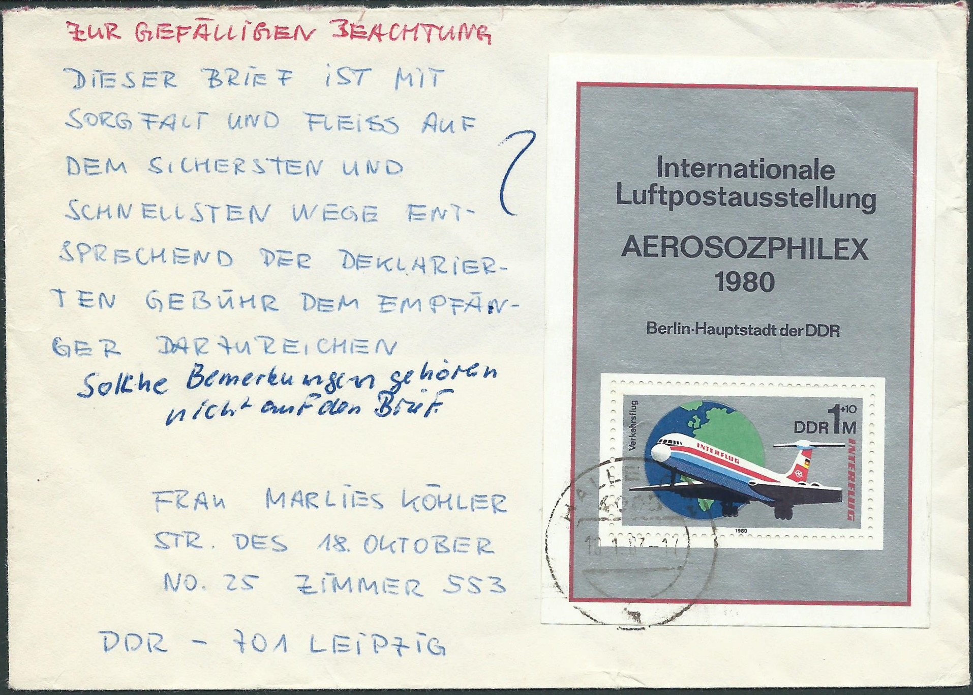 Als ich diesen Beleg in einer Wühlkiste gesehen habe, musste ich erst einmal richtig schlucken. Erst mal die Nebensächlichkeiten: Frankatur Block 59, gestempelt 10.1.83. Dann aber das Wesentliche: Die Schreibereien auf dem Umschlag! Da war ein DDR-Bürger richtig mutig, dass er diese Zeilen auf die Vorderseite schrieb. "Zur gefälligen Beachtung" Das war schon frech. Aber dann: "Dieser Brief ist mit Sorgfalt und Fleiss auf dem sichersten und schnellsten Wege entsprechend der deklarierten Gebühr dem Empfänger darzureichen". Au au, das zu Zeiten der DDR, da konnte die Antwort nicht lange auf sich warten lassen: "Solche Bemerkungen gehören nicht auf den Brief", vermutlich hat das ein Pstbediensteter darauf vermerkt. Da gehörte schon eine ganze Portion Mut dazu, solchen Text zu schreiben. Es würde mich auch nicht wundern, wenn der Absender noch richtig "einen auf die Mütze" bekommen hat. Da bekommt man selbst heute noch ein ungutes Gefühl... Trotzdem habe ich zugegriffen und werde den Beleg in Ehren aufbewahren, das ist schliesslich ein Stück Geschichte.