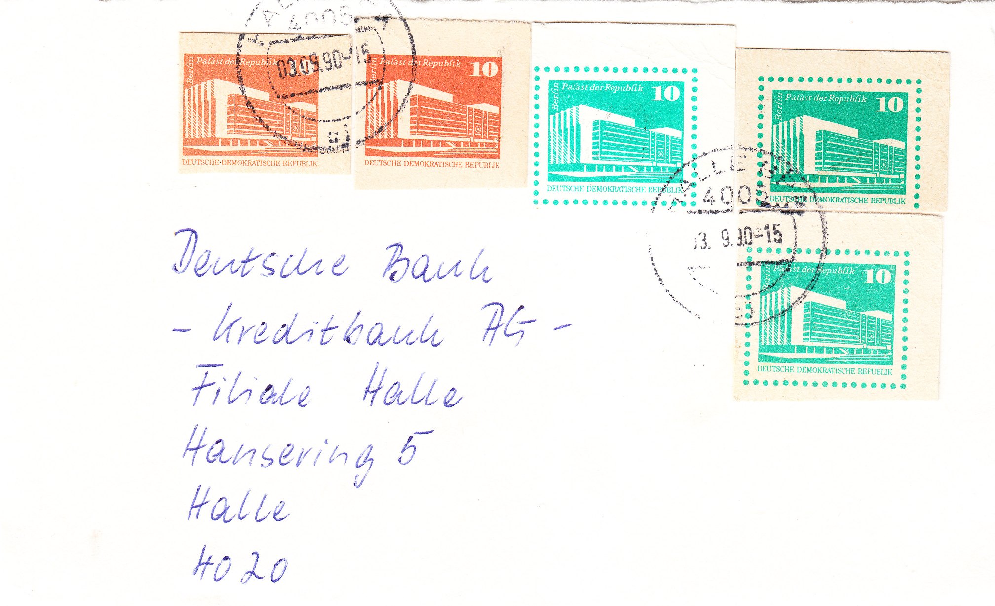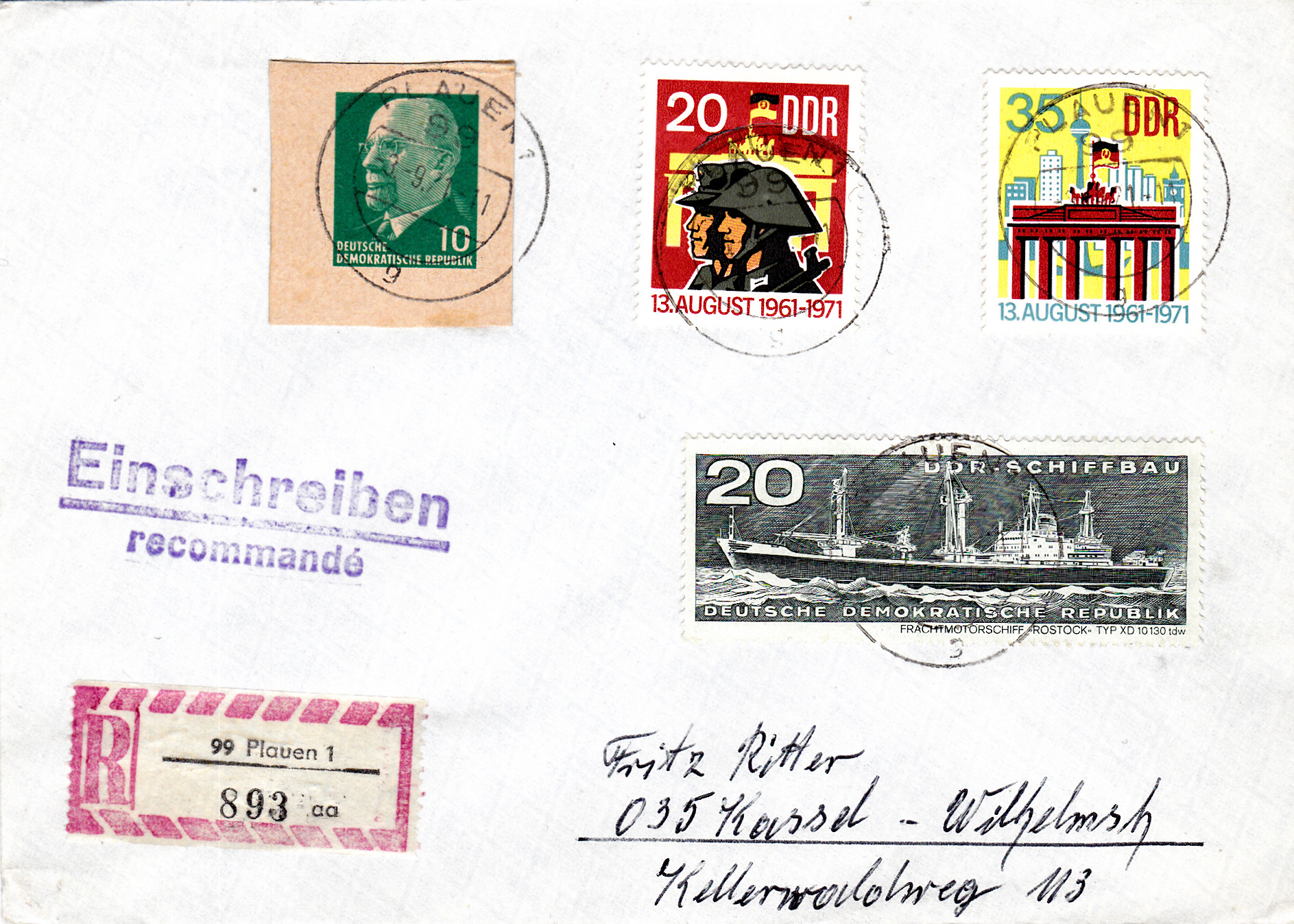 Auf diesem Brief per Einschreiben vom 3.9.1971 von Plauen nach Kassel wurde zur Frankatur auch ein Ganzsachenausschnitt aus einer Postkarte mit einem 10Pf Ulbricht-Wertstempel benutzt. Das Porto betrug: Brief bis 20g in die BRD 35Pf und Zusatzleistung Einschreiben 50Pf.
