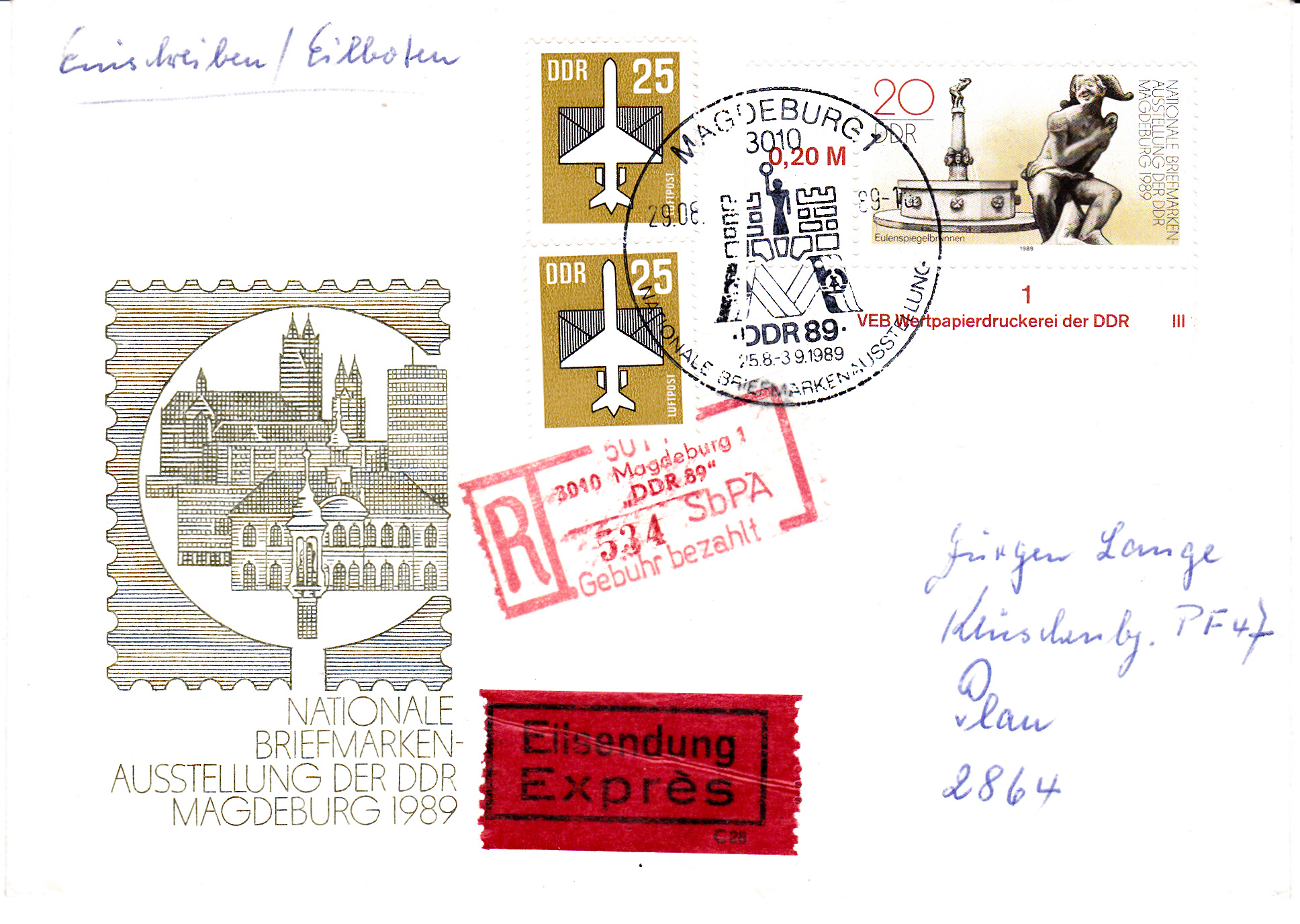 Besonderer Einschreibegebührenzettel mit Eindruck "DDR 89" zur Nationalen Briefmarkenausstellung "DDR 89" auf einem Brief bis 20 g per Einschreiben und Eilboten. Zur Frankatur des Briefportos und der Eilzustellung wurde ein Eckrandstück mit Druckvermerk der Marke zu 20Pf zur Nat. Briefmarkenausstellung (MiNr 3265) und zwei Flugpostmarken zu je 25Pf (MiNr 3129) verwendet. Rückseitig befindet sich ein Ankunftsstempel aus Plau.