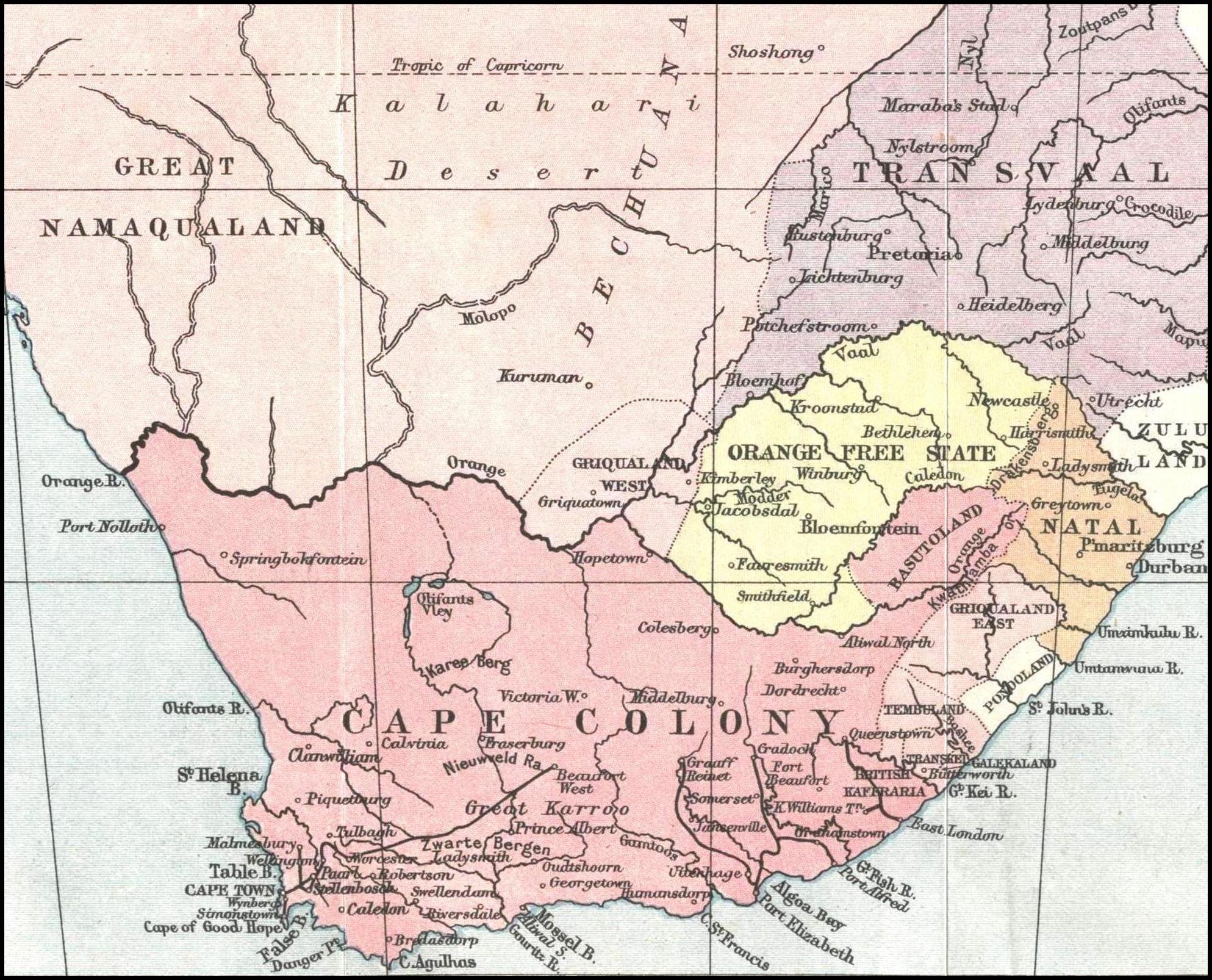 Das "C.G.H" unten im Stempel steht für Cape Good Hope = Kapkolonie. Hier eine zeitgenössische Landkarte, die die damals existierenden Staaten zeigt: