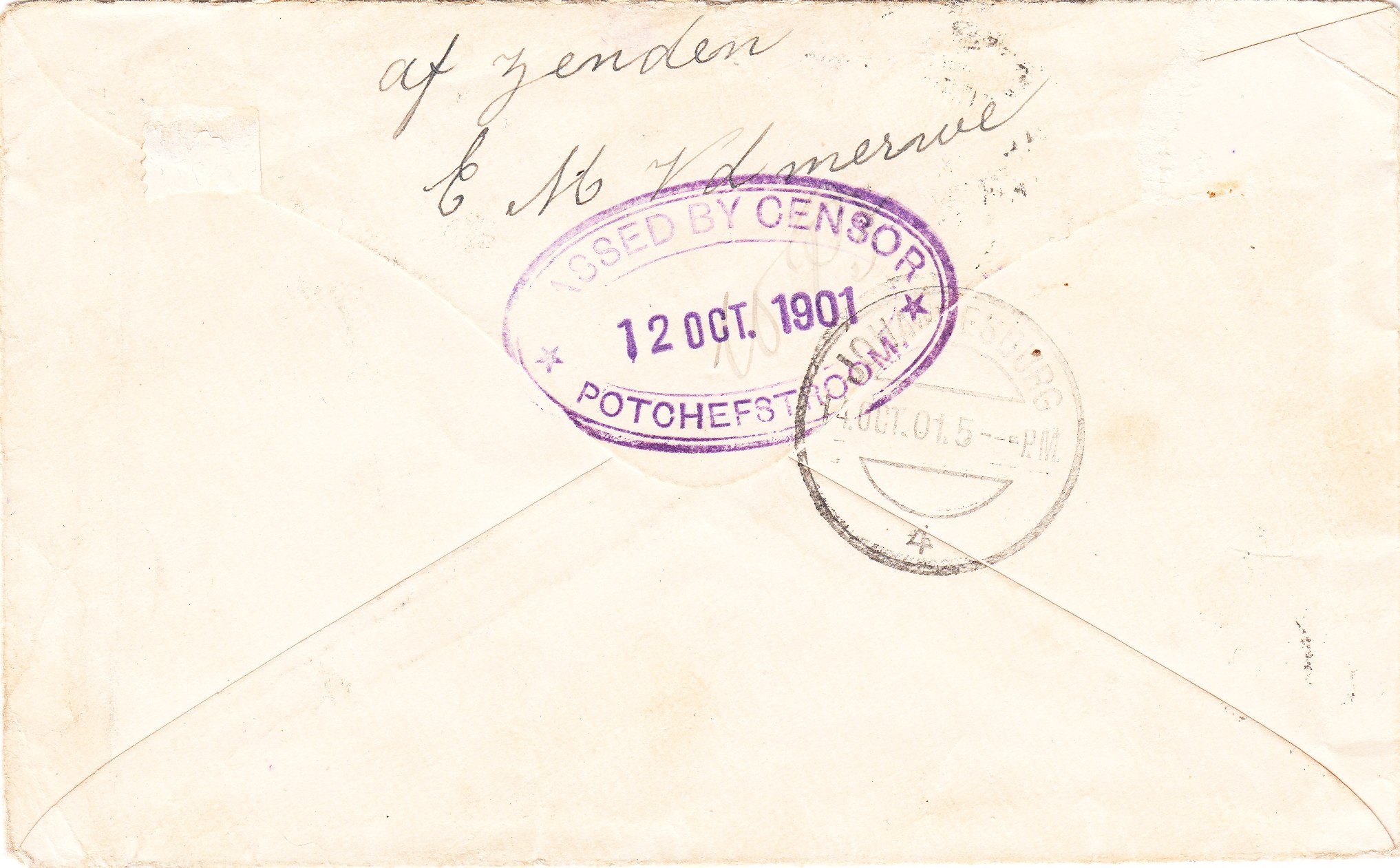 Die Post dieser Kriegsgefangenen Buren wurde von den Briten zensuriert, worauf Stempel hinweisen. Somit praktizierten die Briten während des Burenkrieges erstmals eine offiziell organisierte Postzensur mit Kennzeichnung aller zensurierten Sendungen durch Stempel.