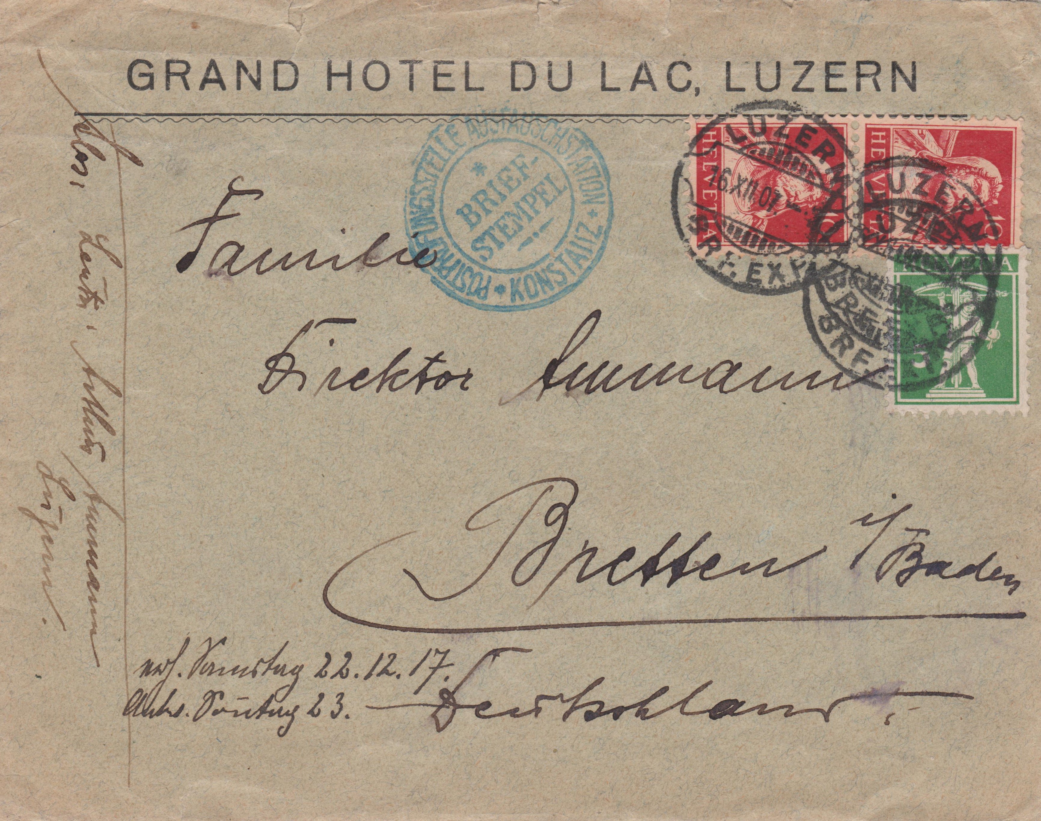 Brief, Portostufe 25 Rappen, adressiert nach Bretten in Baden, aufgegeben am 07.12.1916 in LUZERN in der Schweiz: