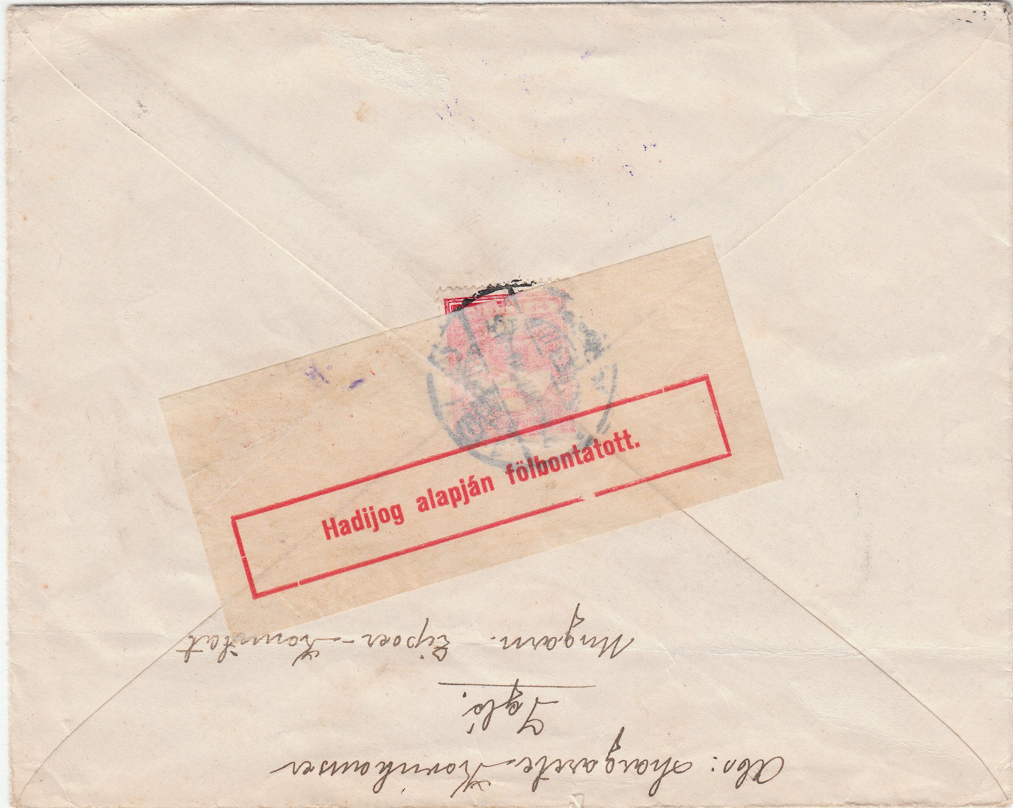 Rückseitig wurde, leider direkt über der Frankatur, ein Verschlußzettel im für Ungarn üblichen länglichen Querformat, hier 91 x 40 mm angebracht, der in einem Rahmen die Inschrift "Hadijog alapján fölbontatott." in roter Druckfarbe trägt: