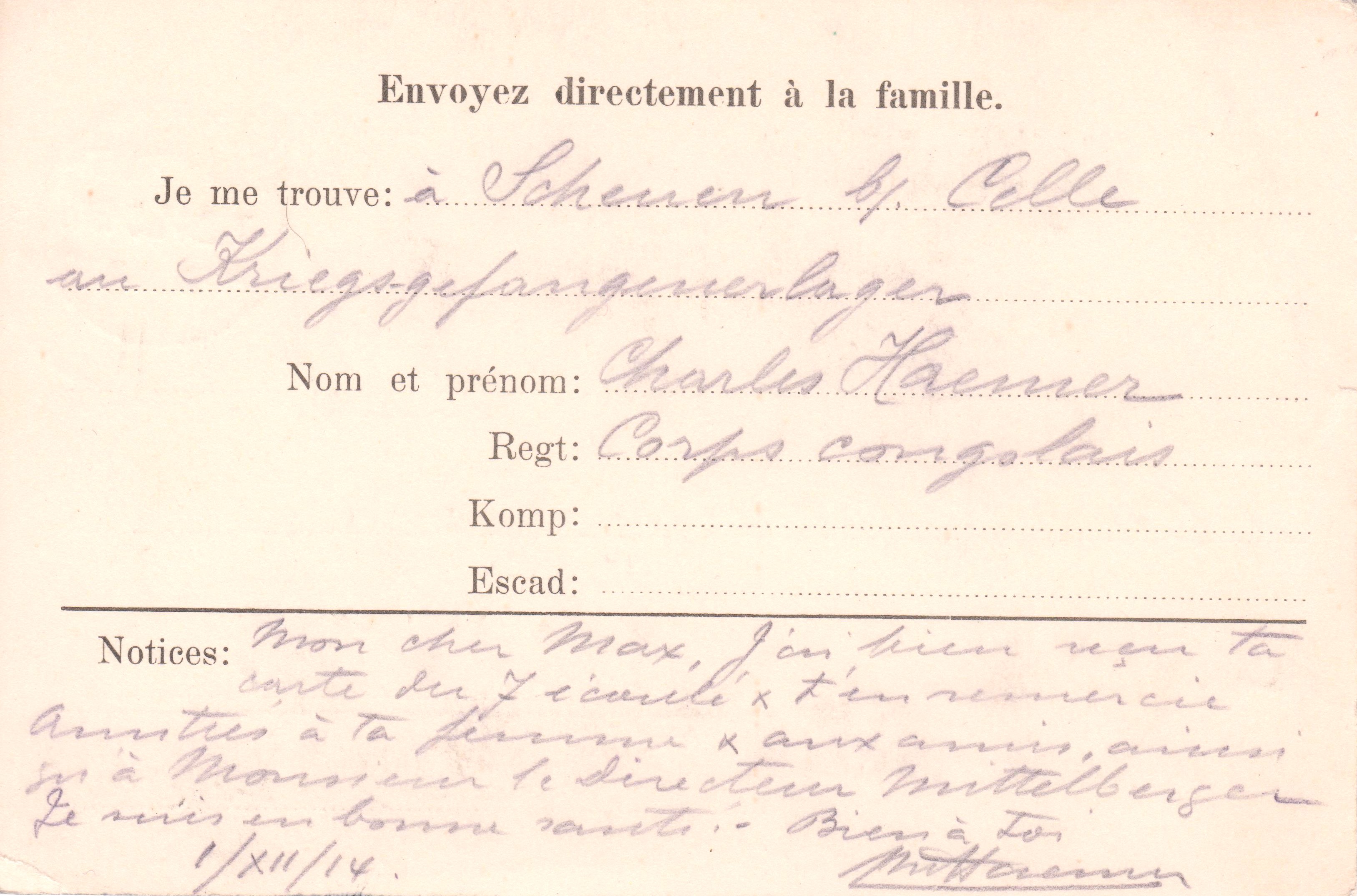 An schließend wurde diese Feldpostkarte der Post zur Beförderung übergeben, was ein Tagesstempel CELLE 1 f vom 07.12.1914 dokumentiert: