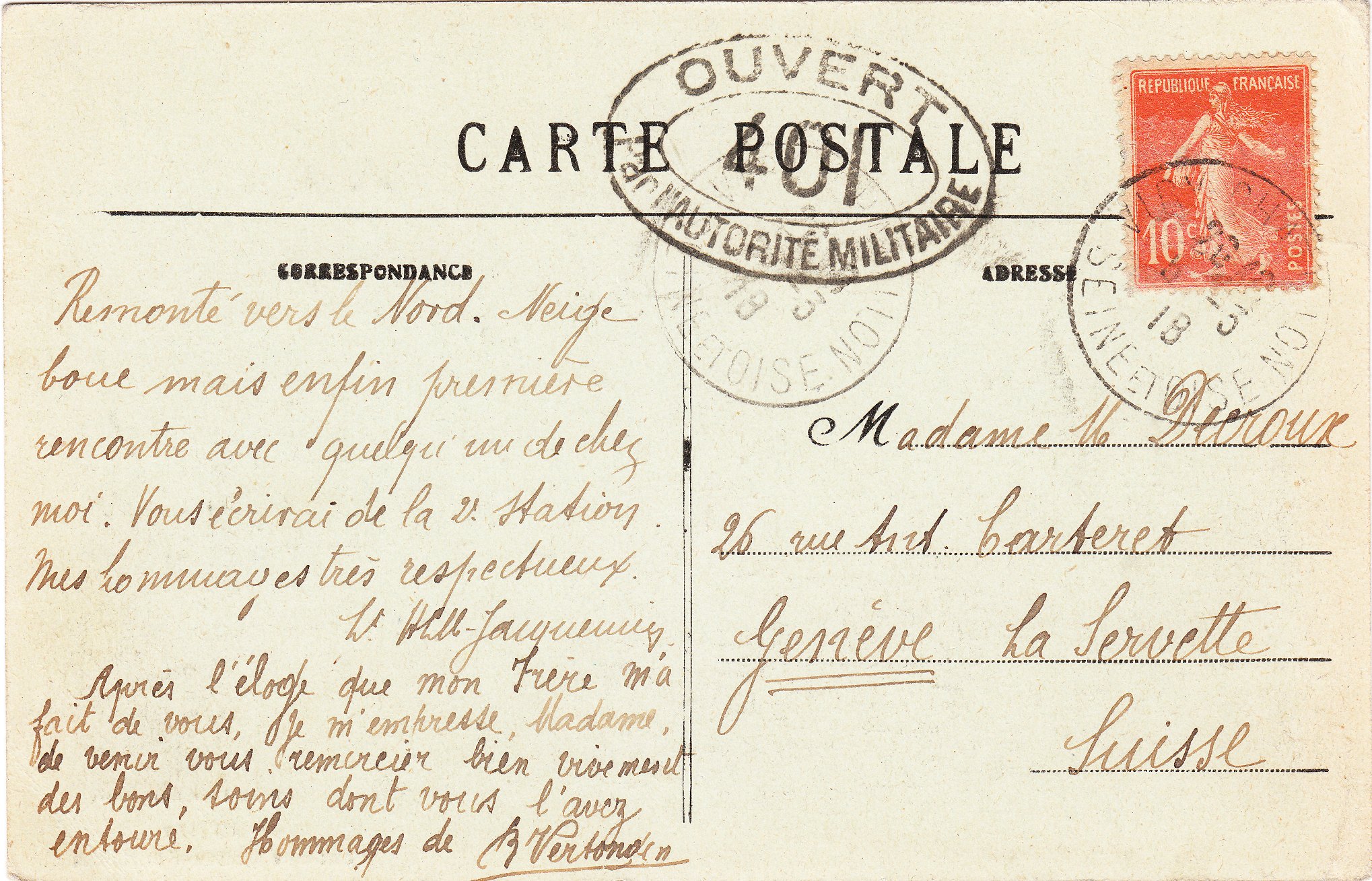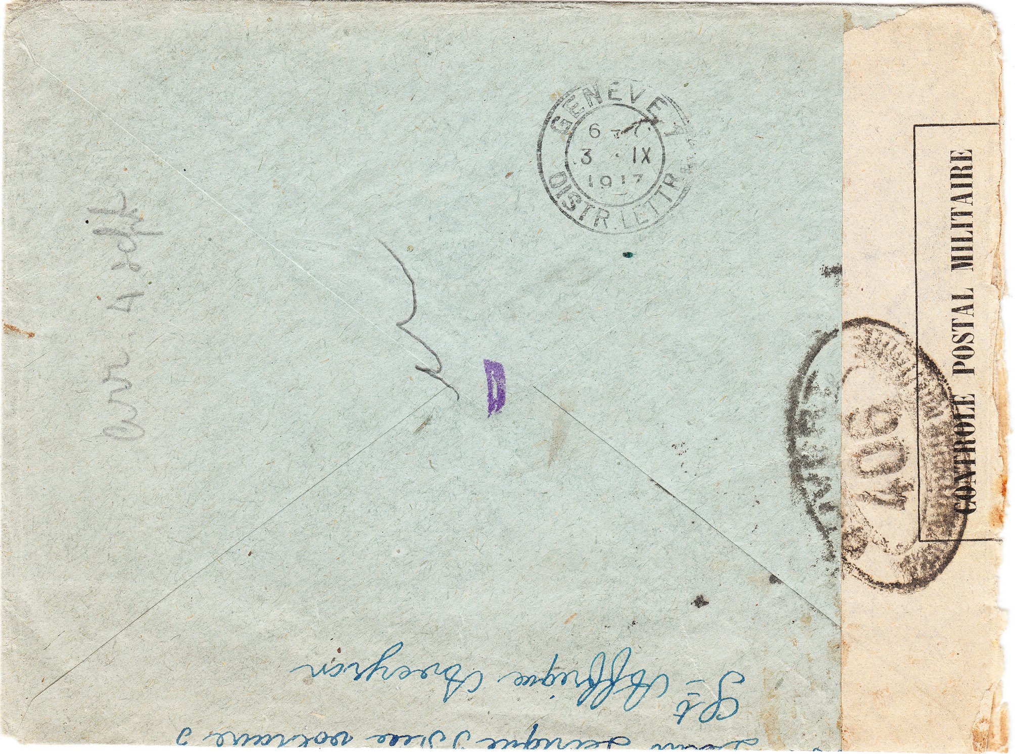 Der am 27.08.1917 in Saint-Affrique im französischen Département Aveyron aufgegebene Beleg kam am 03.09.1917 an seinem Bestimmungsort Genf an.