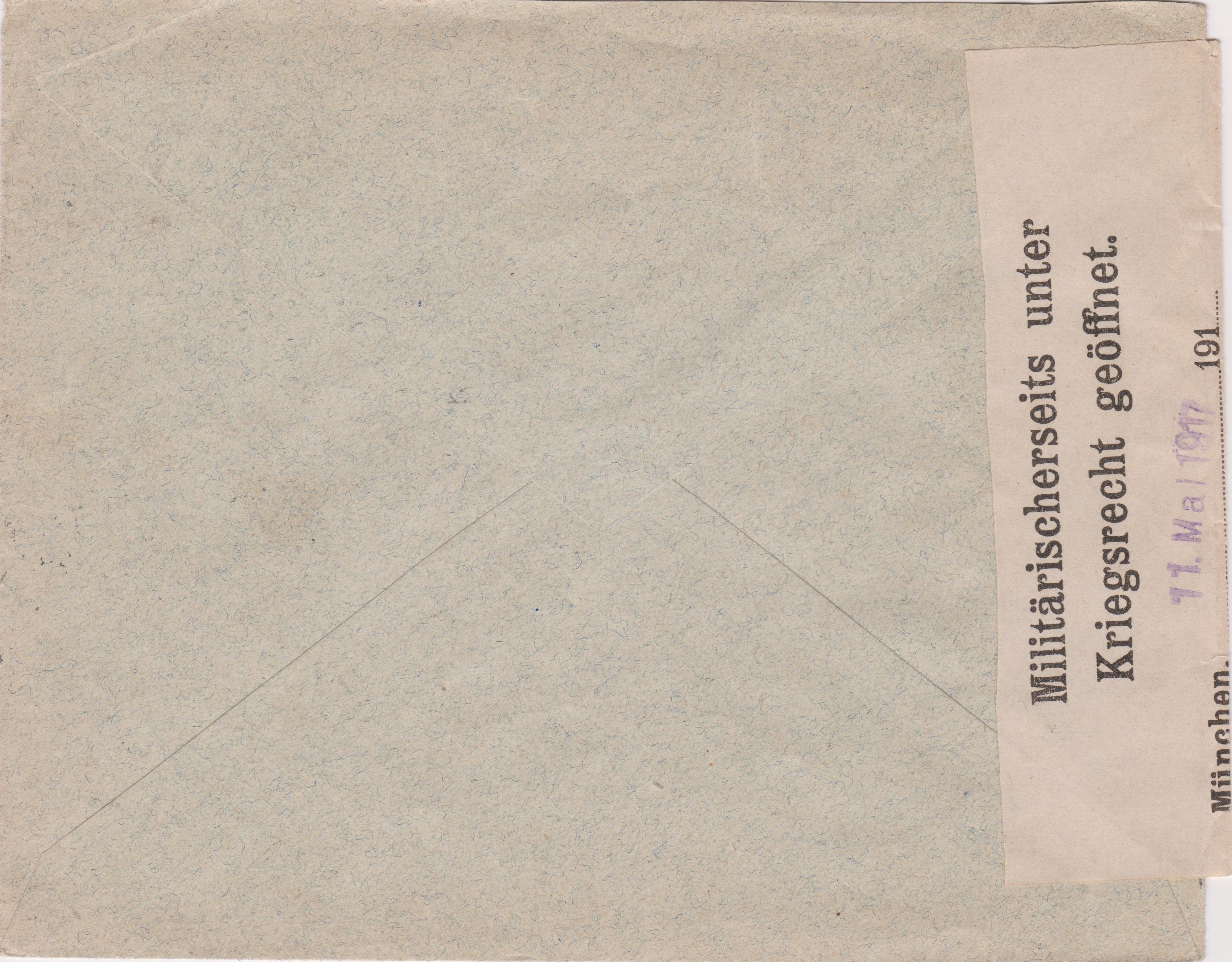 Dieser nach Leipzig adressierte, am 10.05.1917 in HERISAU in der Schweiz aufgegebene Brief wurde linksseitig geöffnet und nach erfolgter Orüfung mit einem Verschlußzettel "Militärischerseits unter Kriegsrecht geöffnet. München,........... 191... Ueberwachungsoffizier.":