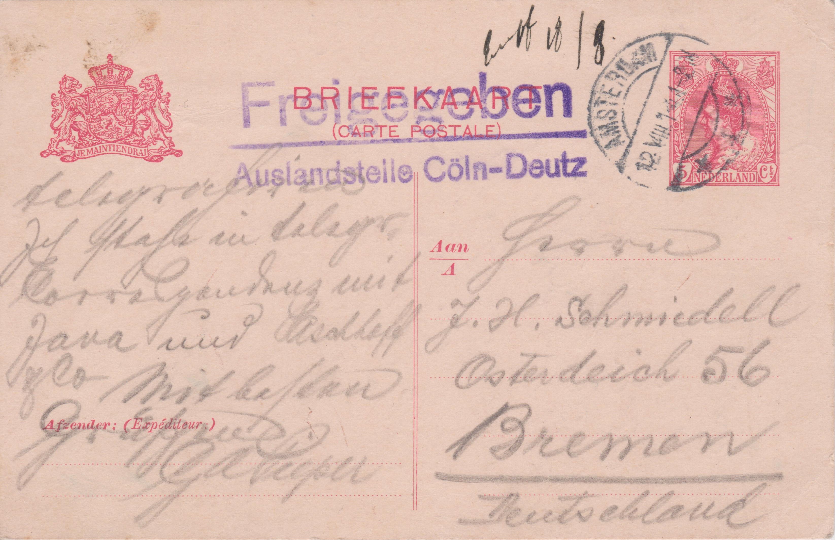Diese in AMSTERDAM am 12.08.1914 aufgegebene Postkarte nach Bremen wurde der Auslandsstelle Cöln-Deutz zugeleitet, wo nach erfolgter Prüdfung ein Prüfstempel "Freigegeben Auslandsstelle Cöln-Deutz" abgeschlagen wurde: