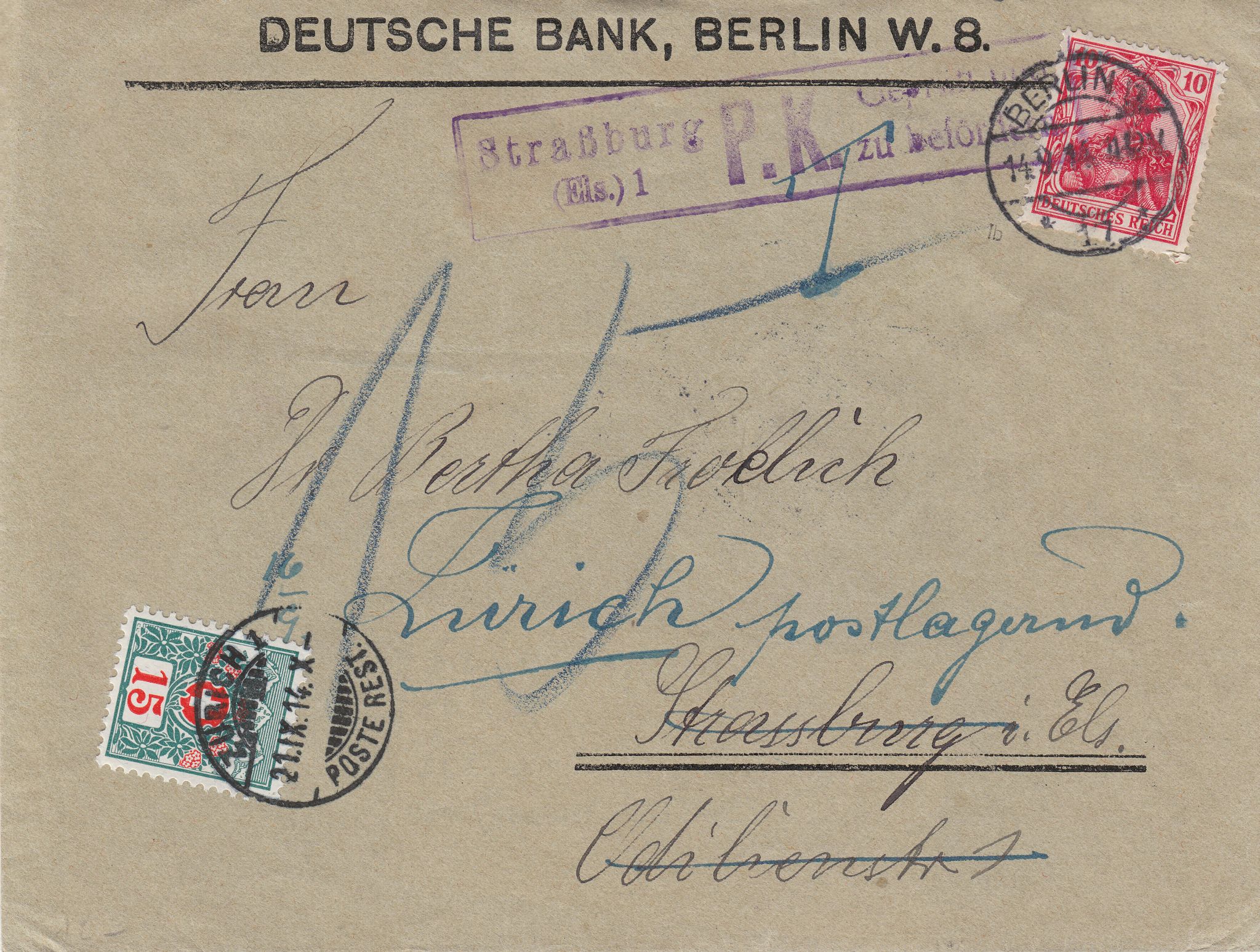 Am 21.09.1914 um 8 Uhr früh kam der Brief beim Ausgabeschalter für postlagernde Sendungen in Zürich an und es wurde rückseitig ein Tagesstempel "ZÜRICH 1 POSTE RESTANTE" angebracht sowie vorderseitig als bei der Abholung zu zahlende Lagergebühr "15" (Rappen) in Blaustift vermerkt wurde.