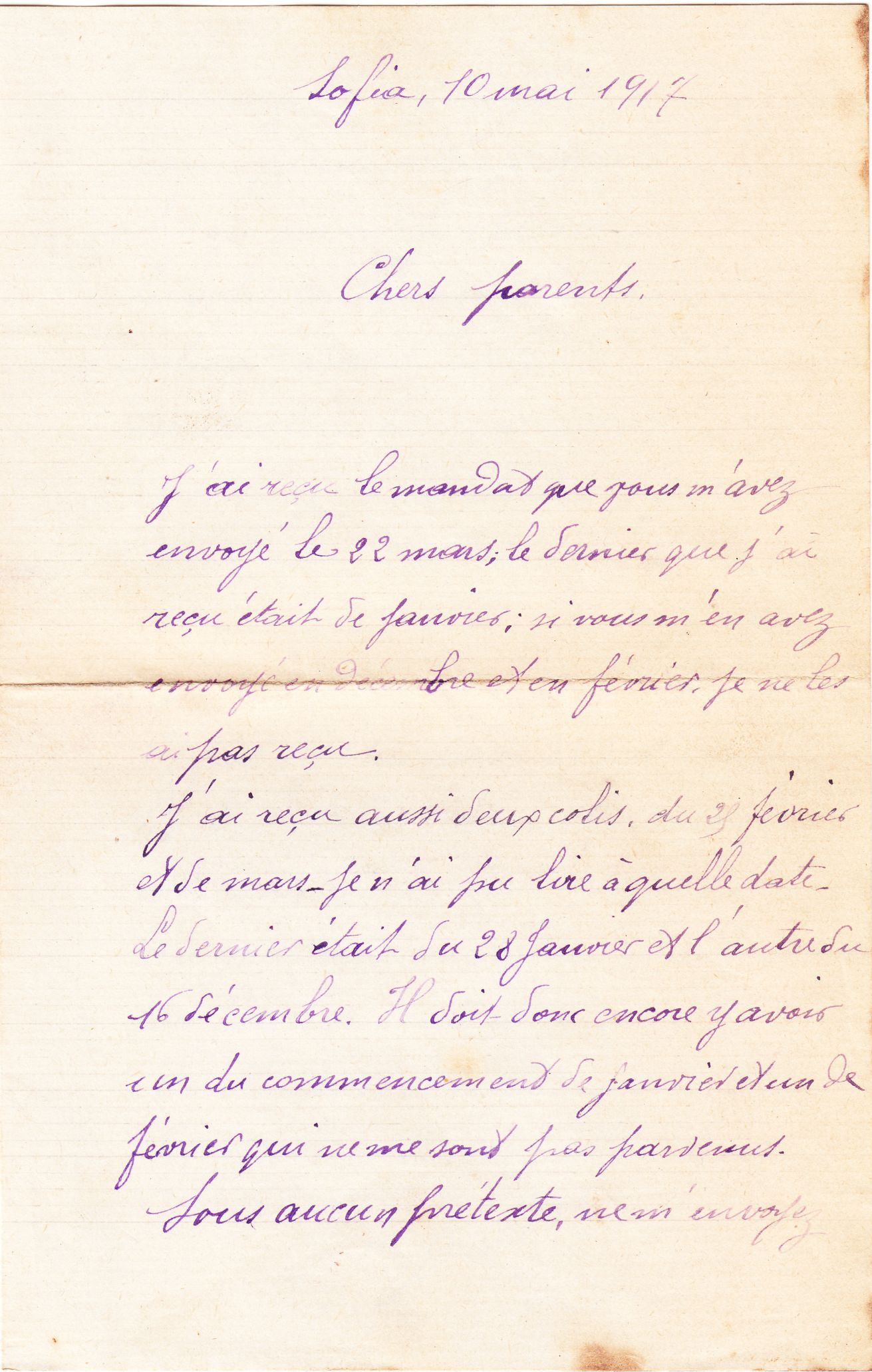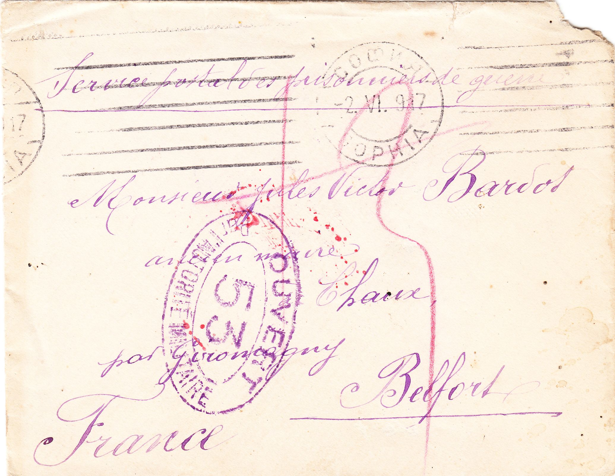 Portofreie Kriegsgefangenenpost, die, adressiert nach Belfort in Frankreich, am 02.06.1917 in Sofia in Bulgarien von einem französischen Kriegsgefangenen aufgegeben wurde: