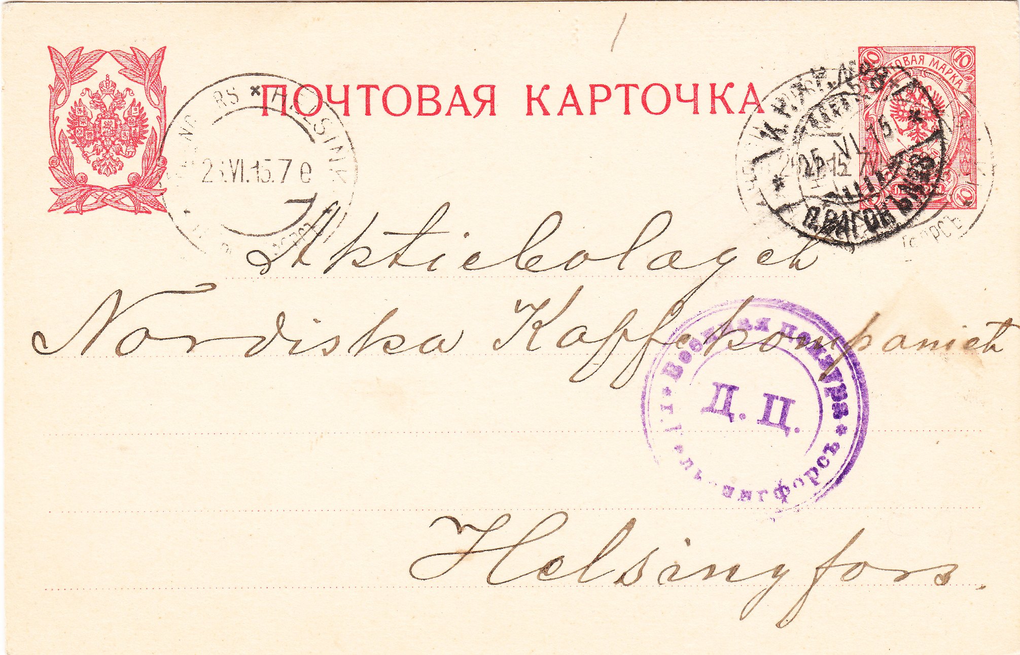 Es wurde ein violetter Dreikreisstempel der finnischen Militärzensur abgeschlagen "военная цензура Д. Ц. Гельсингфорсъ" = "Militär Zensur D.Z. Helsingfors".